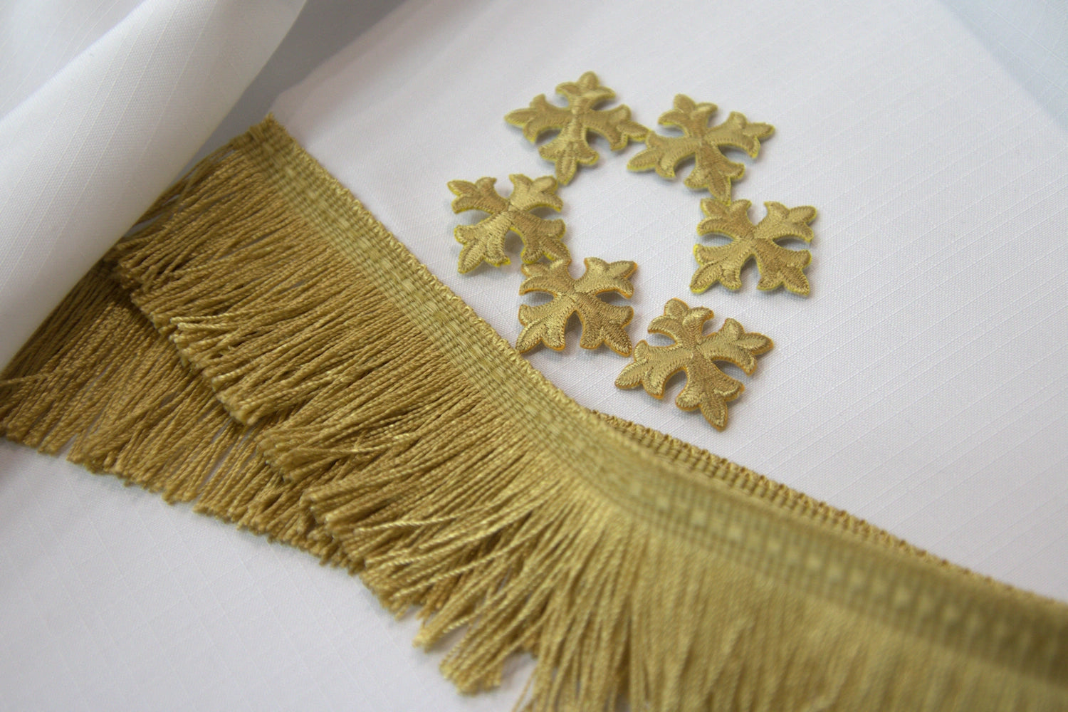 The iron-on crosses allow for simple placement and alignment before stitching, while the antique gold fringe provides a classic decorative finish for the lower edge of the stole.