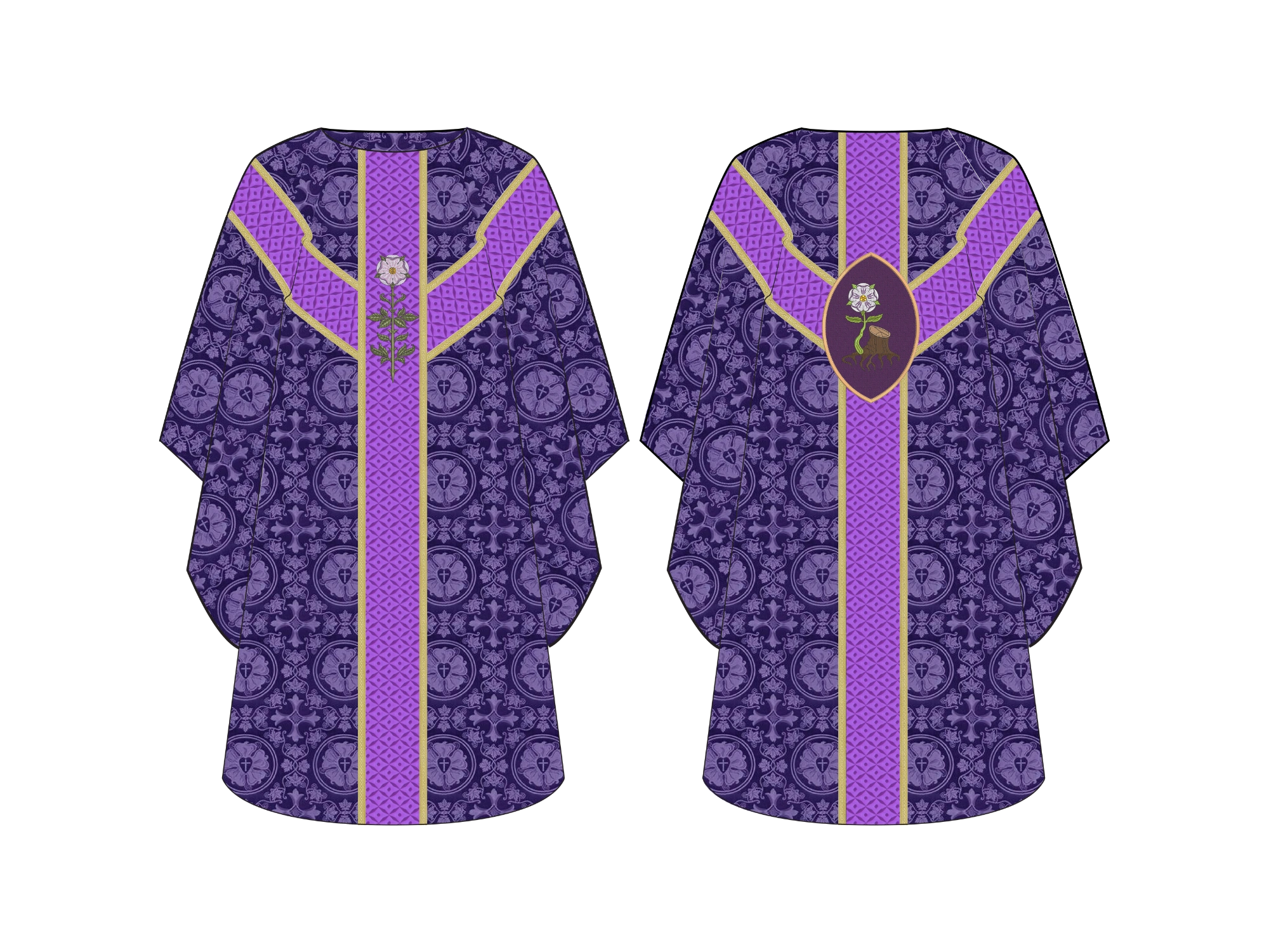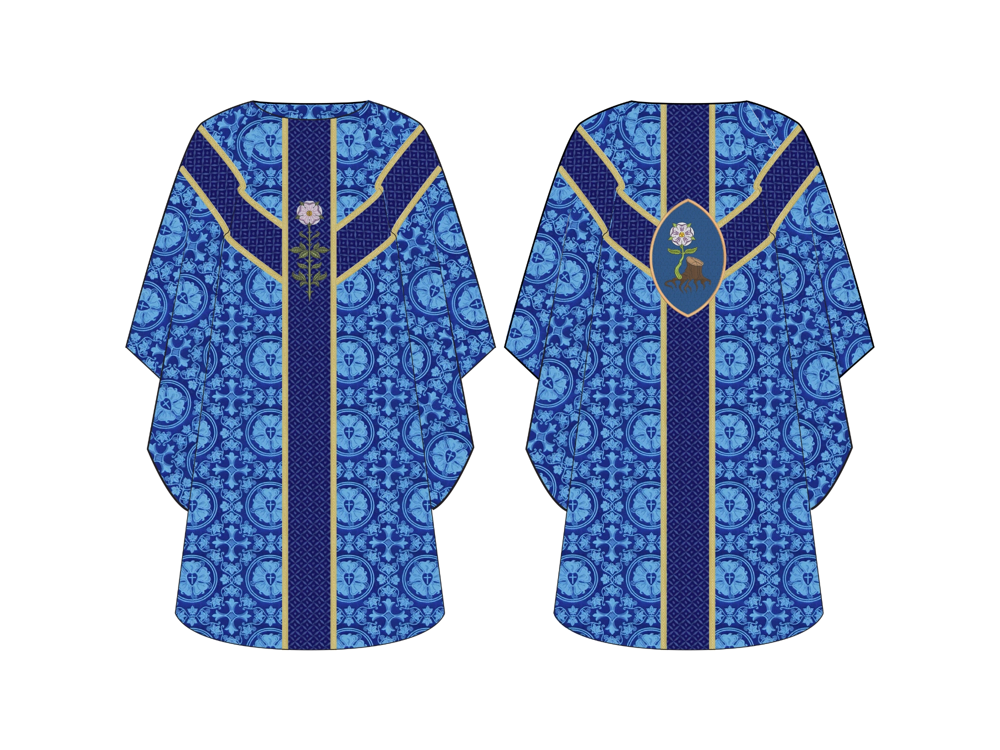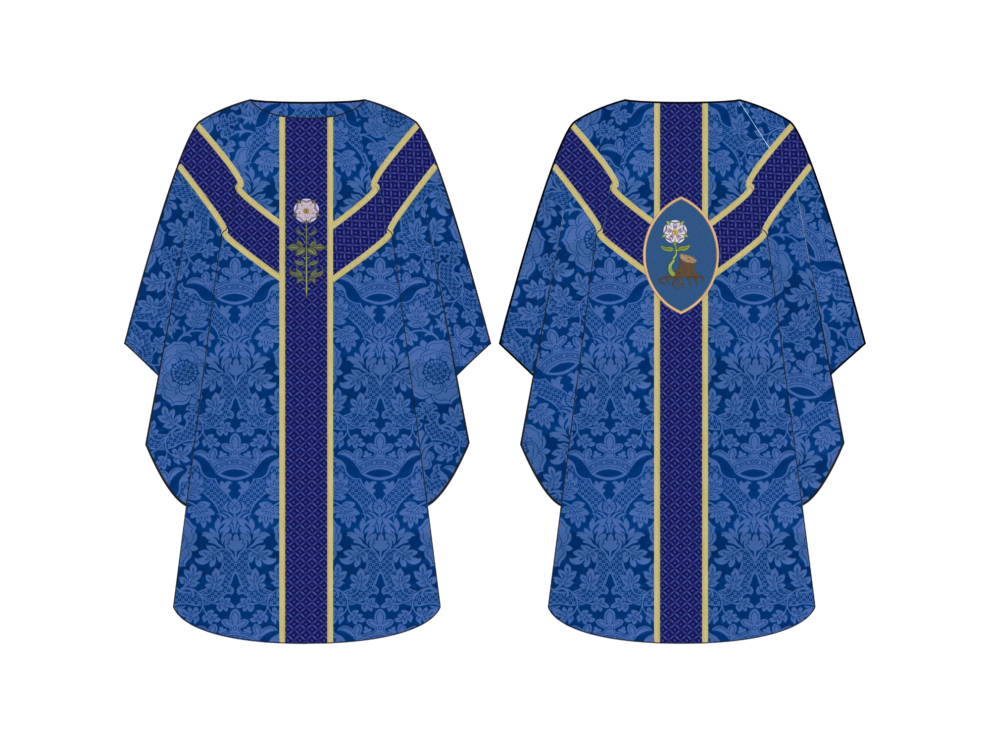 The Jesse Stump Oval Chasuble from the Great O'Antiphon Collection is a beautiful piece made from rich European brocade fabrics. Its unique design features a Messianic rose and stem on the front, and an oval applique on the back that beautifully portrays the stump of Jesse with tree roots blossoming into a majestic Messianic Rose, symbolizing the prophecy of Christ’s lineage and the fulfillment of God’s promise.
