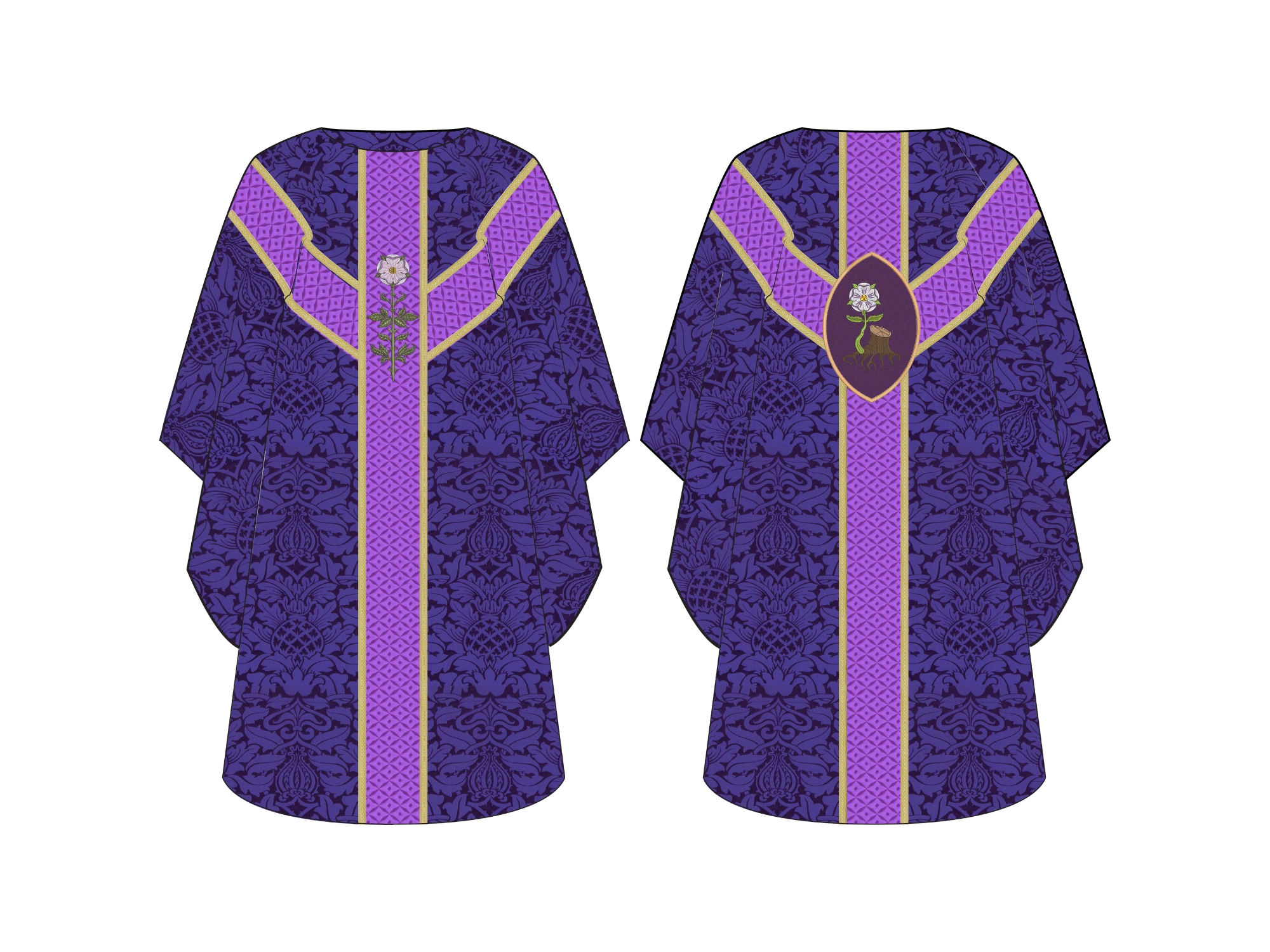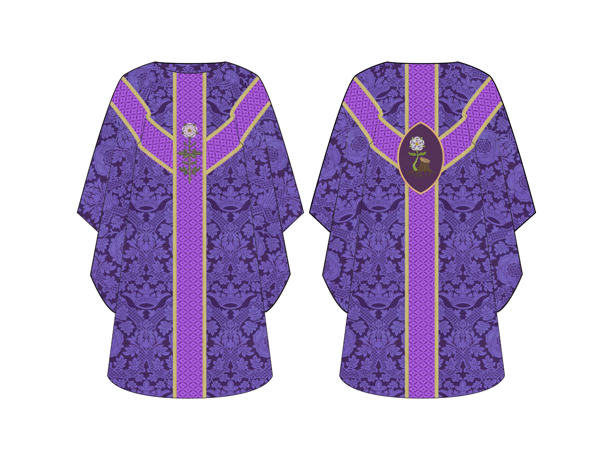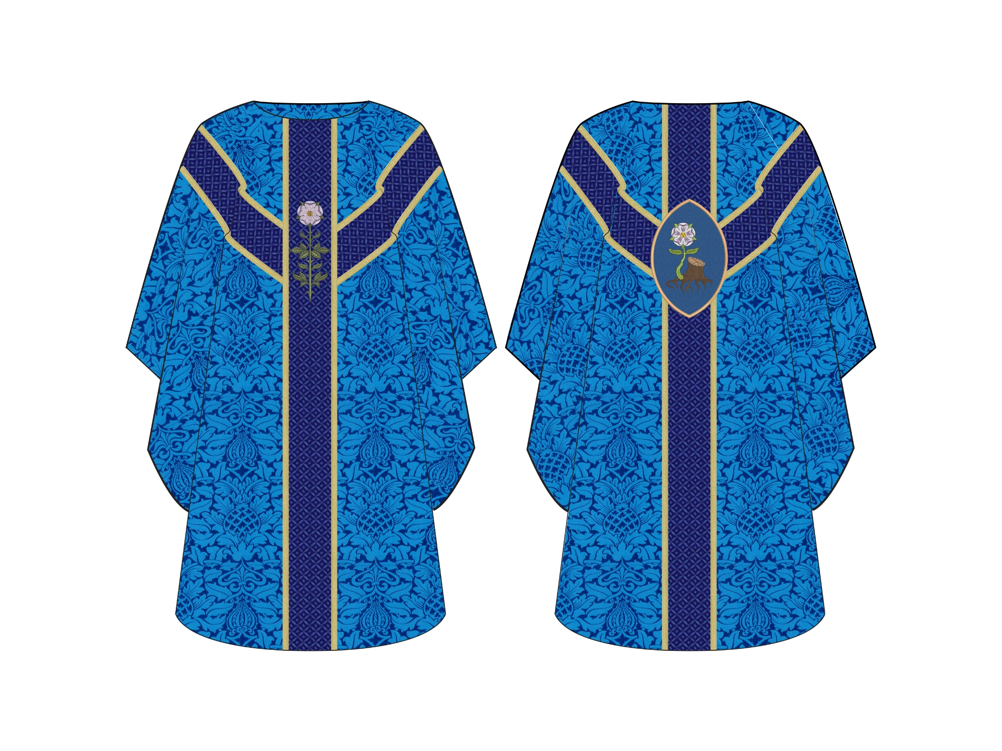 The Jesse Stump Oval Chasuble from the Great O'Antiphon Collection is a beautiful piece made from rich European brocade fabrics. Its unique design features a Messianic rose and stem on the front, and an oval applique on the back that beautifully portrays the stump of Jesse with tree roots blossoming into a majestic Messianic Rose, symbolizing the prophecy of Christ’s lineage and the fulfillment of God’s promise.