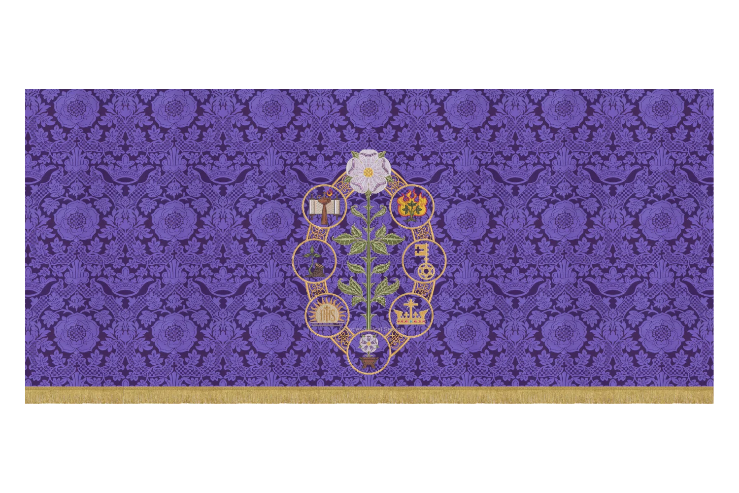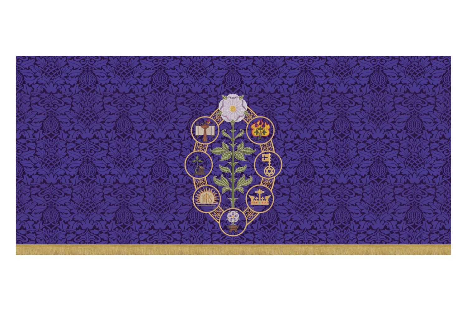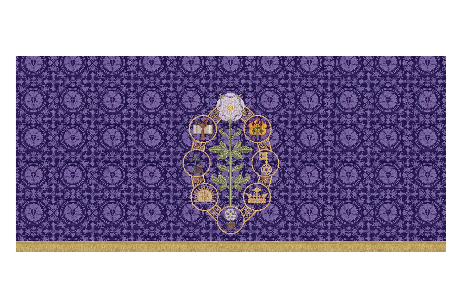 Introducing the "O Antiphon Full Frontal," a beautiful piece of church art that holds deep meaning. It shows a rose, symbolizing the Virgin Mary, with seven O Antiphon symbols around it, all carefully embroidered in bright colors. This frontal is perfect for Advent, helping to bring out the important themes of the season. It adds both beauty and tradition to your church, making it a special addition to your altar.