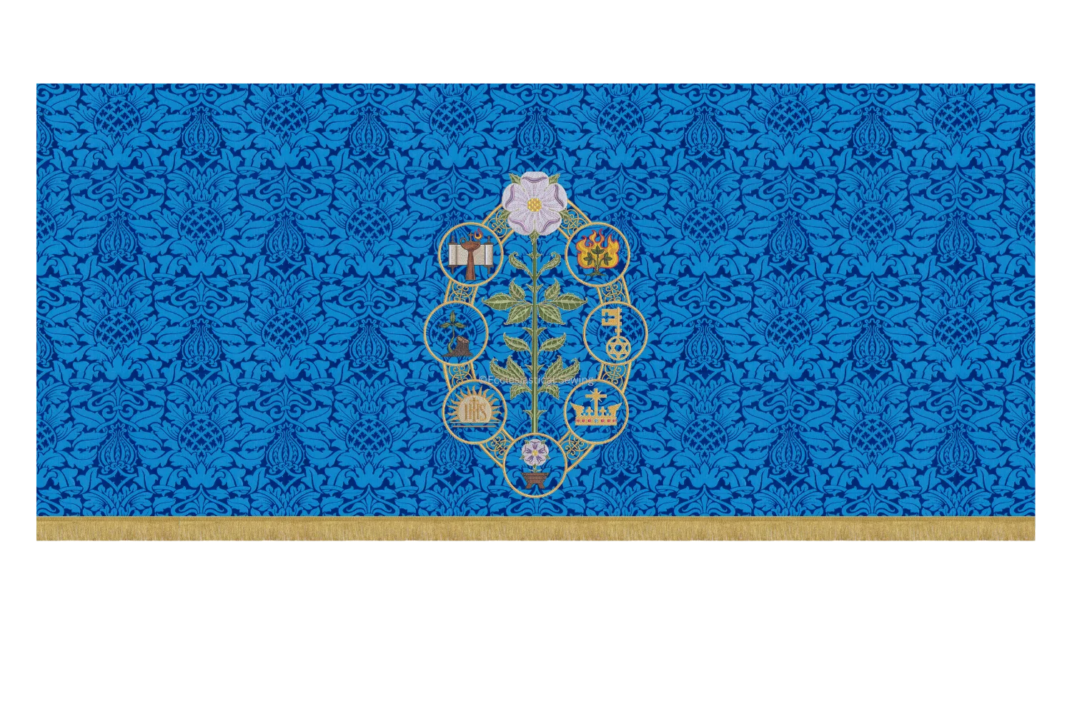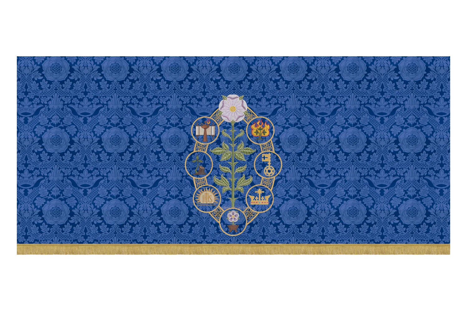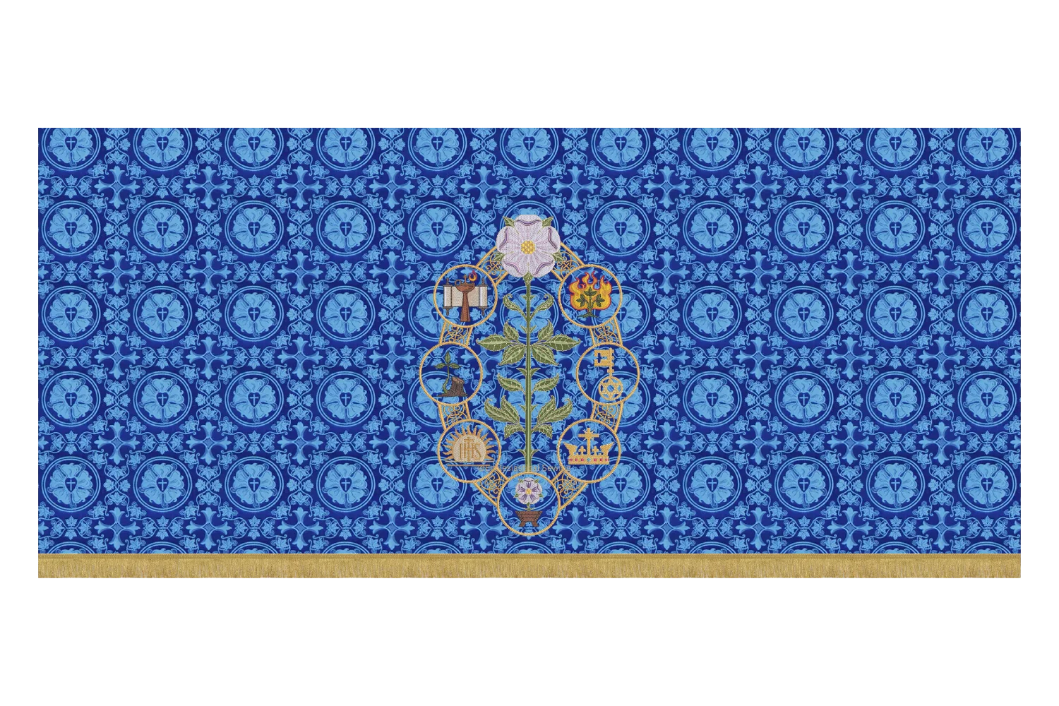 Introducing the "O Antiphon Full Frontal," a beautiful piece of church art that holds deep meaning. It shows a rose, symbolizing the Virgin Mary, with seven O Antiphon symbols around it, all carefully embroidered in bright colors. This frontal is perfect for Advent, helping to bring out the important themes of the season. It adds both beauty and tradition to your church, making it a special addition to your altar.