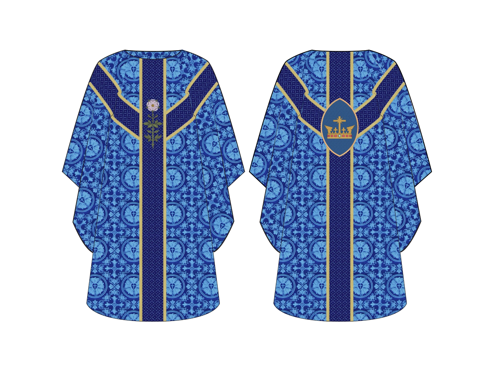 The Rex Gentium Oval Chasuble from the Great O'Antiphon Advent Collection, featuring a Messianic rose and stem embroidery representing purity and promise, and an Oval applique with the Rex Gentium symbol showcasing Christ as the King of All Nations, is a beautifully designed liturgical chasuble made from luxurious European Brocade in Blue or Violet that adds elegance to Advent celebrations.