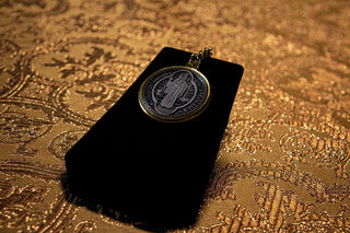 On one side, you’ll find the image of Saint Benedict, holding the cross and the Rule—a reminder of the order, discipline, and deep faith that defined his life. Around him is the Latin inscription: Eius in obitu nostro praesentia muniamur—"May we be strengthened by his presence in the hour of our death."