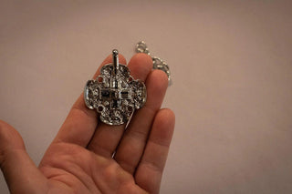 Clasp is sewn to vestment, has hook and chain closure. You will receive a free PDF download with instructions for sewing the morse clasp with purchase.