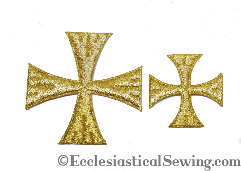 Small iron on cross appliques are useful when time is tight and a cross is needed to adorn the back neckline of a stole, or to adorn a burse, chalice veil, stole front, or other liturgical item. The crosses are embroidered appliques with an iron on backing.