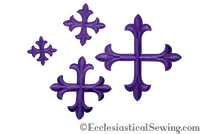 Small cross appliques in Violet. These rayon cross iron on appliques are used to adorn the back neckline of a stole or to adorn a burse, chalice veil, stole front, or other liturgical item. The crosses are embroidered appliques with an iron-on backing. Stitching is recommended for long term use.