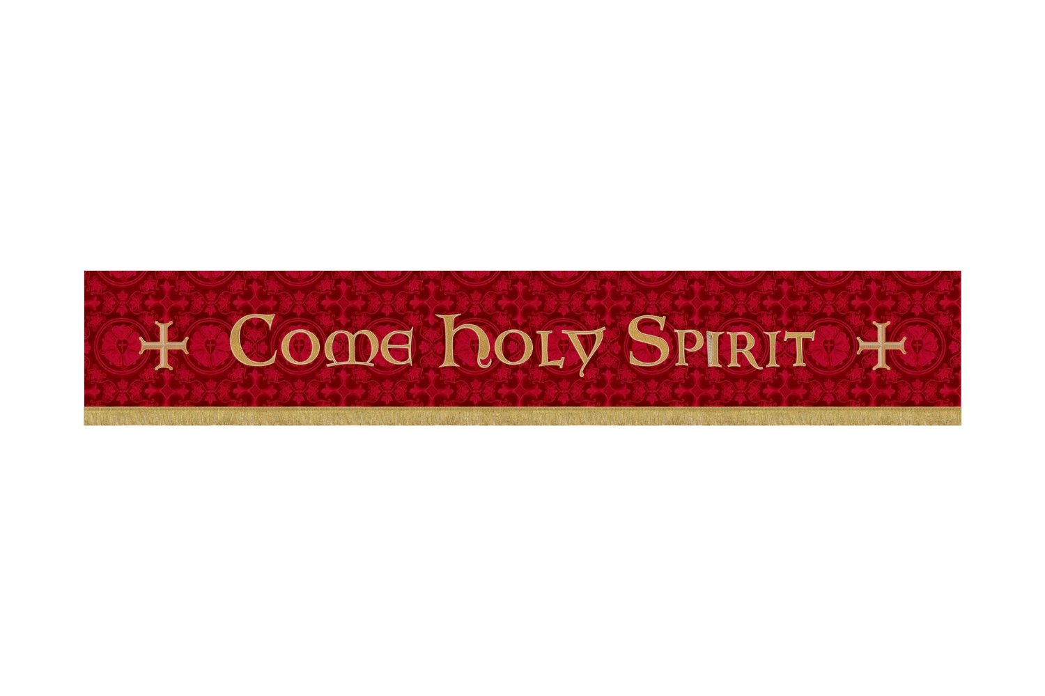 A red Pentecost superfrontal featuring the invocation “Come Holy Spirit” centered on the altar, flanked by gold crosses and finished with a gold fringe hem. Designed to give visual voice to the Church’s ancient prayer for the Spirit’s presence and power.