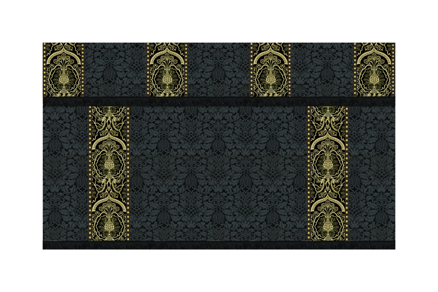 This elegant altar covering is crafted from luxurious Black European Brocade and features two vertical black and gold orphrey bands on the full frontal and four coordinating orphrey bands across the attached superfrontal. Finished with black fringe and black and gold dice braid trim, this design reflects a perfect balance of reverence, symmetry, and sacred beauty.