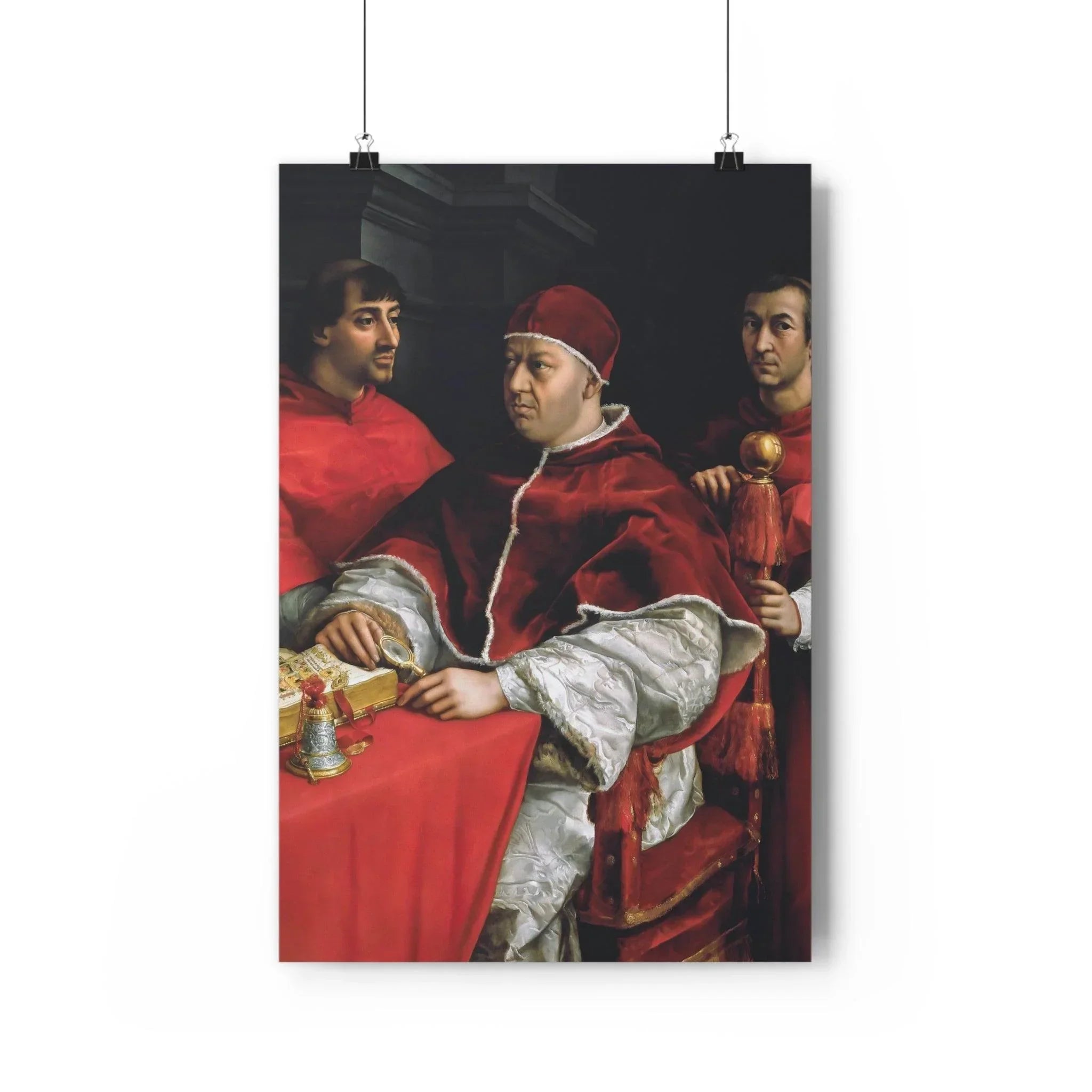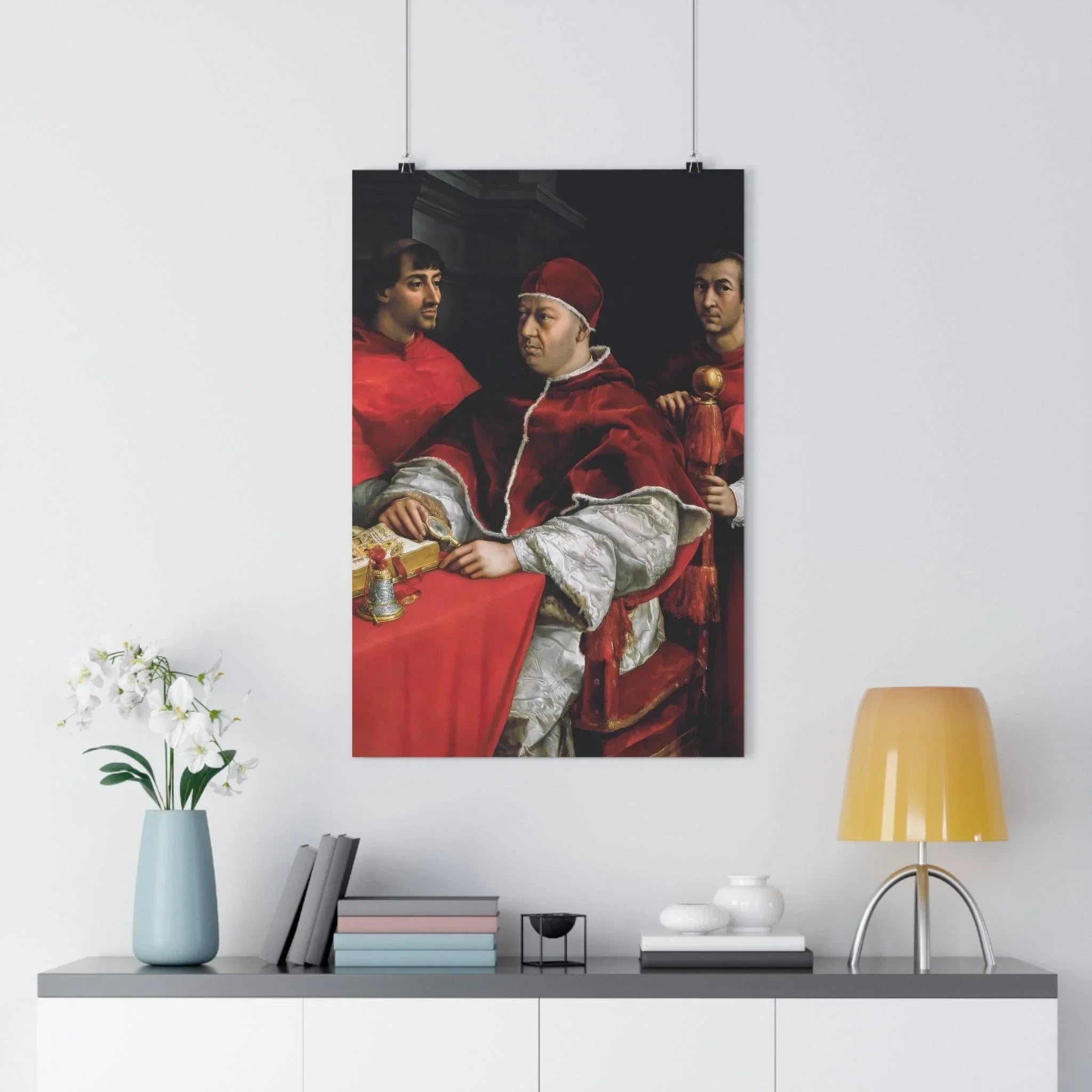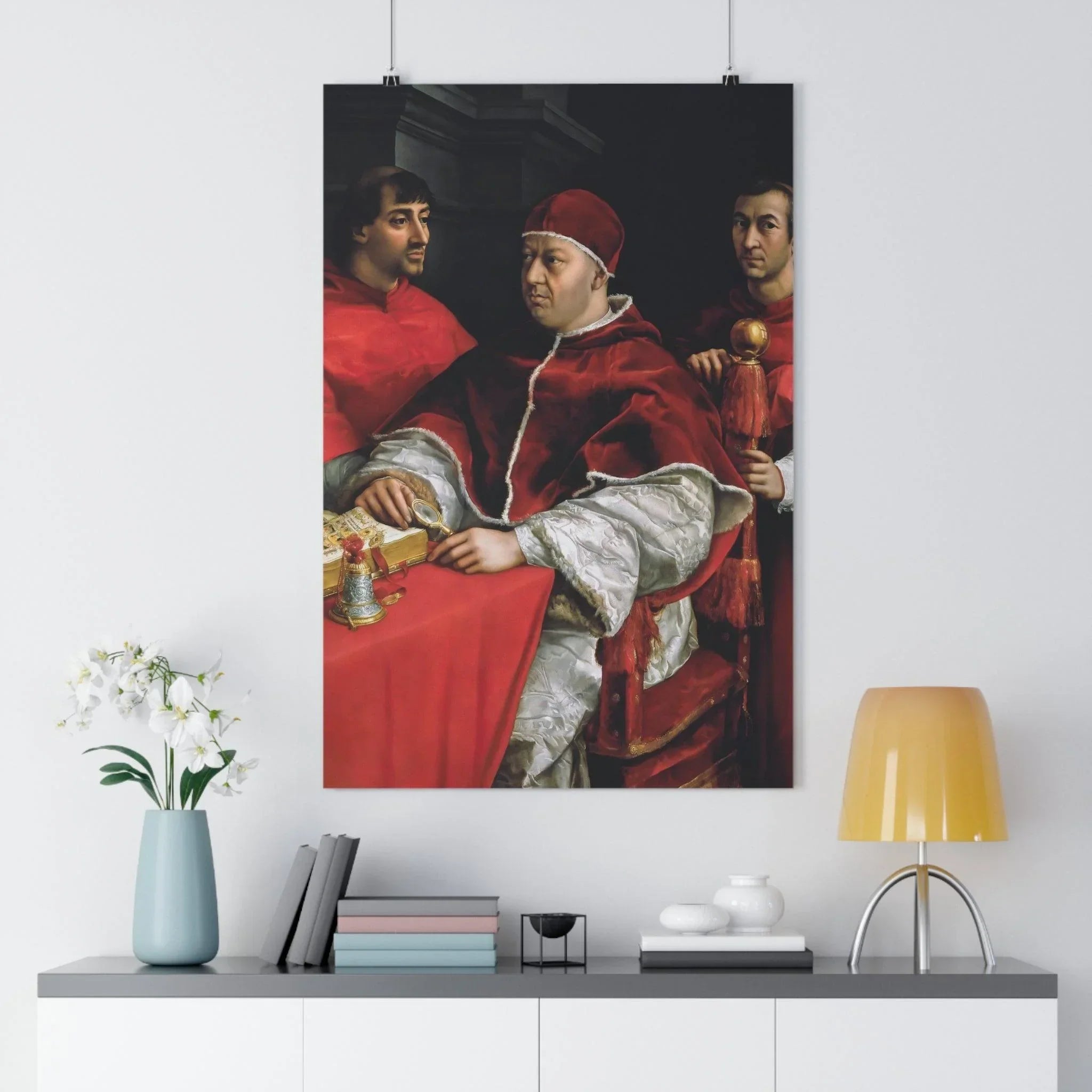 Experience the sacred splendor of the Renaissance era as you behold this iconic religious artwork, capturing the profound significance of Pope Leo X and the esteemed cardinals. Immerse yourself in the intricate details and masterful brushwork of the original painting, preserved in this exquisite print. From the regal presence of Pope Leo X to the dignified expressions of Cardinals Giulio de' Medici and Luigi de' Rossi, this artwork exudes an aura of reverence and spiritual grandeur, offering a tangible connection to the historical and religious significance it represents.