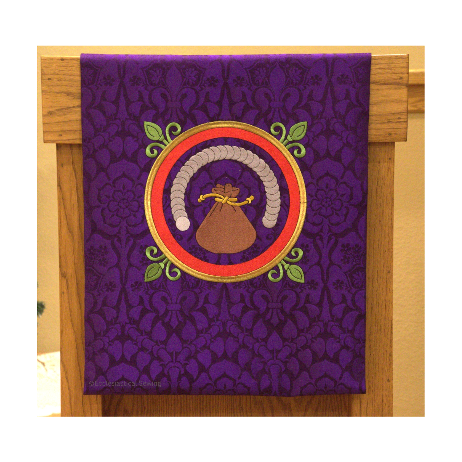 This Lenten season with our Violet Lent Pulpit Fall, features a striking symbol of 30 pieces of silver and a money bag—a powerful representation of Judas' betrayal.