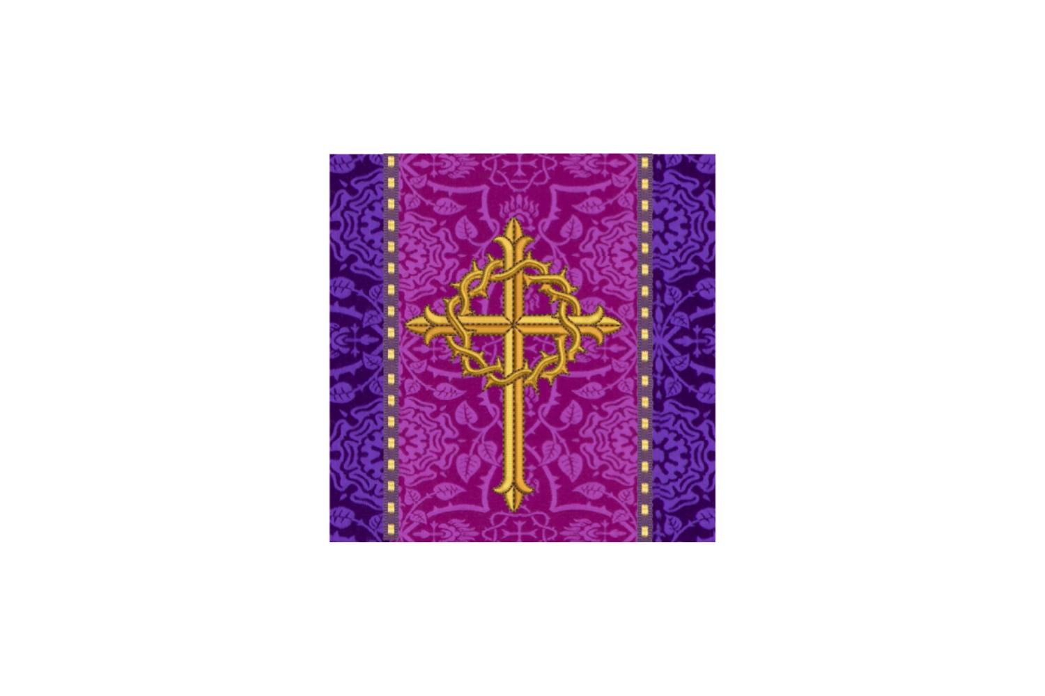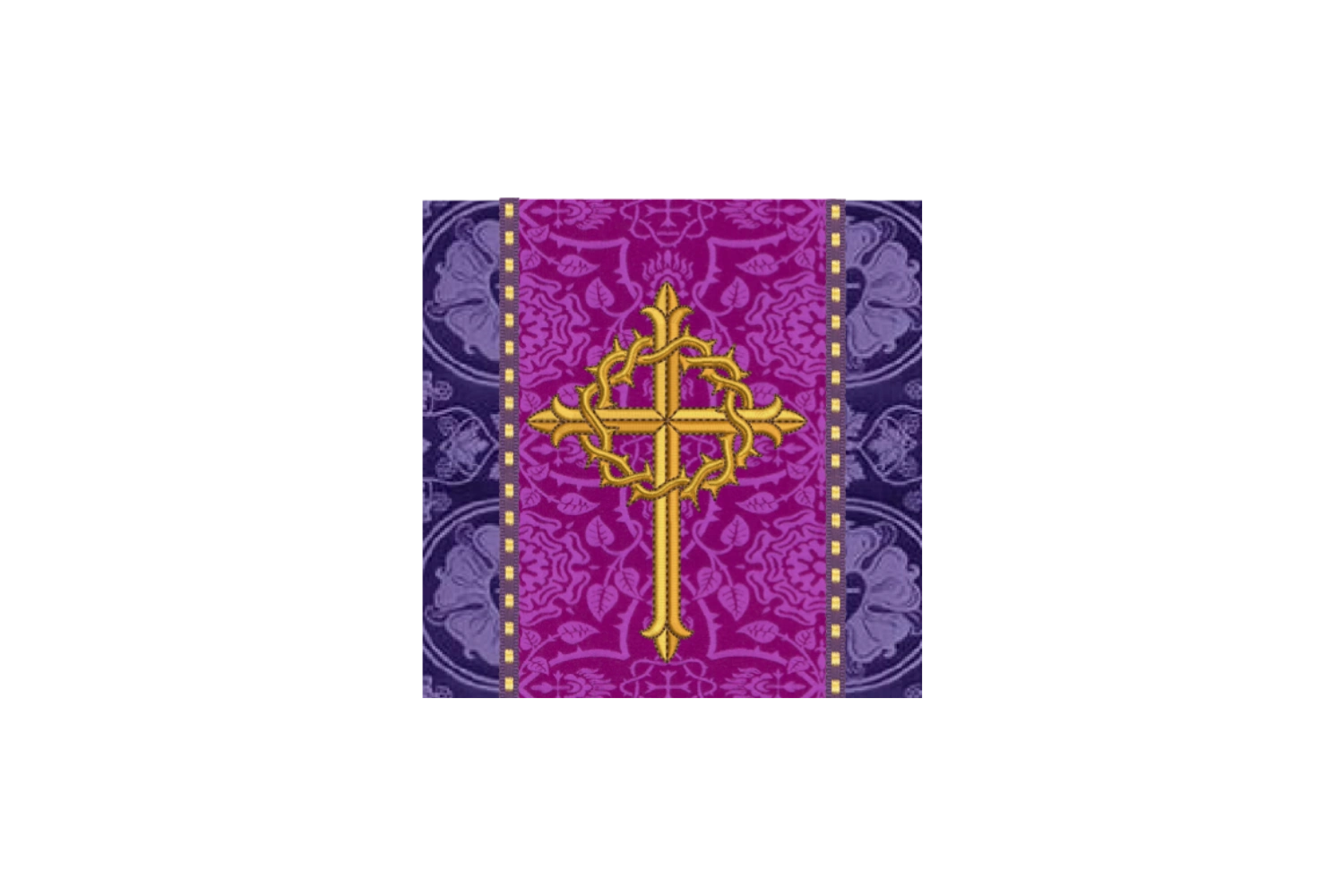 Crafted in rich violet Glastonbury or Luther Rose brocade, the burse is framed with a Roman Purple orphrey band, giving liturgical contrast appropriate to the solemnity of the season. The design evokes the unity of Christ’s sacrificial love—the Cross of Salvation held within the Crown of Thorns, which was placed upon His head in mockery yet became a symbol of His glory.