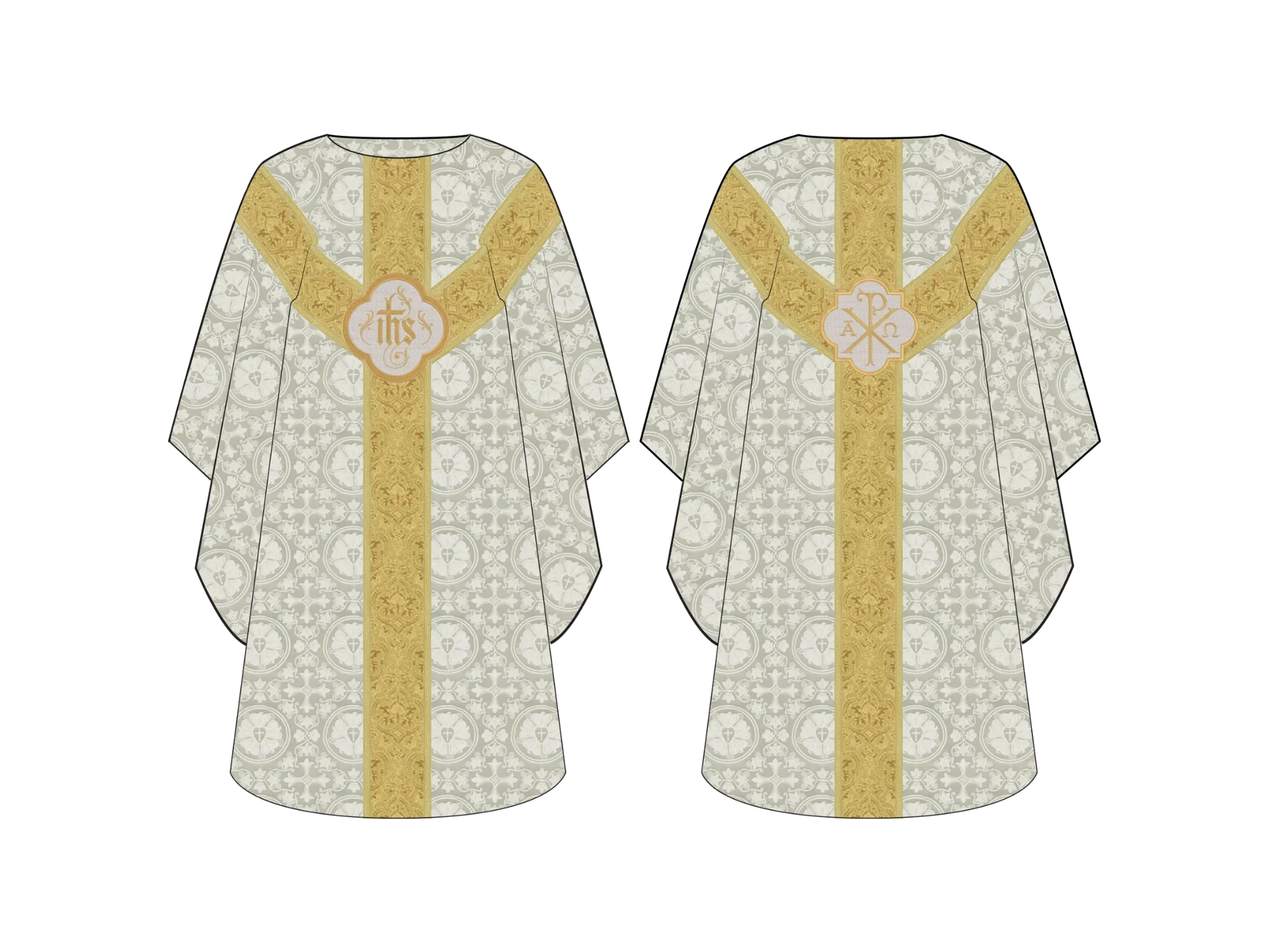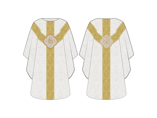 Made from luxurious European Brocade fabrics, the soft and durable white or ivory material ensures both comfort and longevity. The intricate gold orphrey bands exude an air of grandeur and refinement, while the central IHS and Chi Rho appliques evoke a sacred and reverent ambiance for your liturgical celebrations.