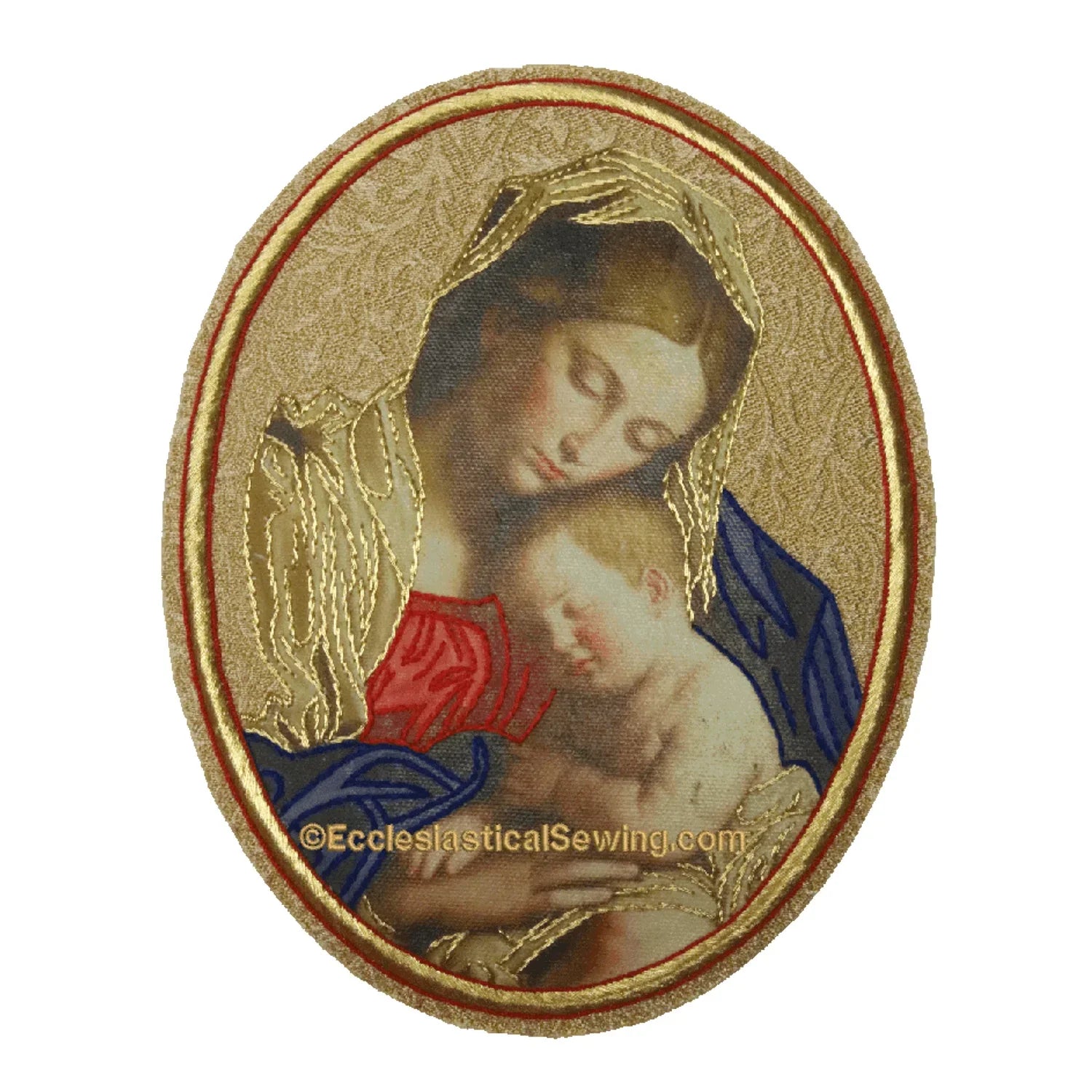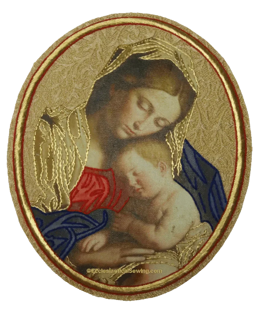 This is our special hand-painted Madonna and Child Applique with goldwork and silk embroidery accents. The design captures the beauty of the Virgin Mary with the Christ Child in this unique hand embroidered applique. The oval-shaped applique is the perfect size for use on the front or back for a chasuble or on the hood of a cope. The image is hand painted on canvas with a cloth of gold background. The design has a goldwork border with a scant 1/4" edge left free for use in hand couching to the vestment of your choice. The design would also be suitable for use on altar hangings and banners.