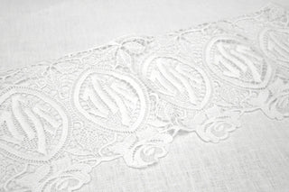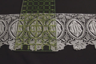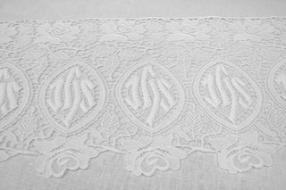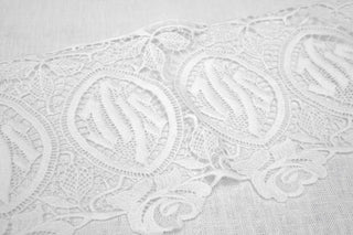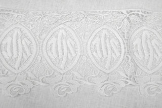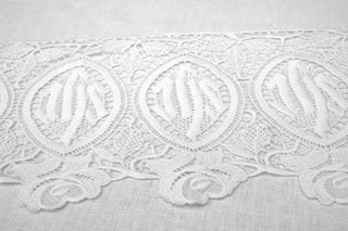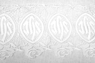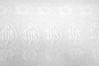 A classic style lace trim gallon for use in making runners, vestments, albs, surplices and altar cloths. The lace features a Rose motif with an IHS design.