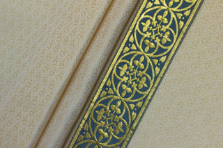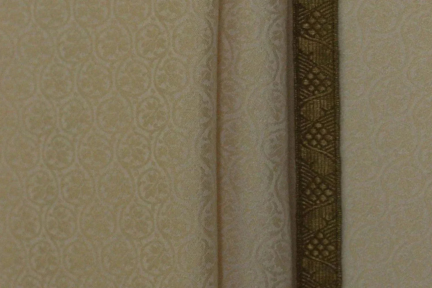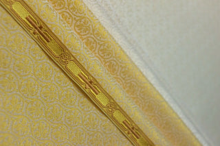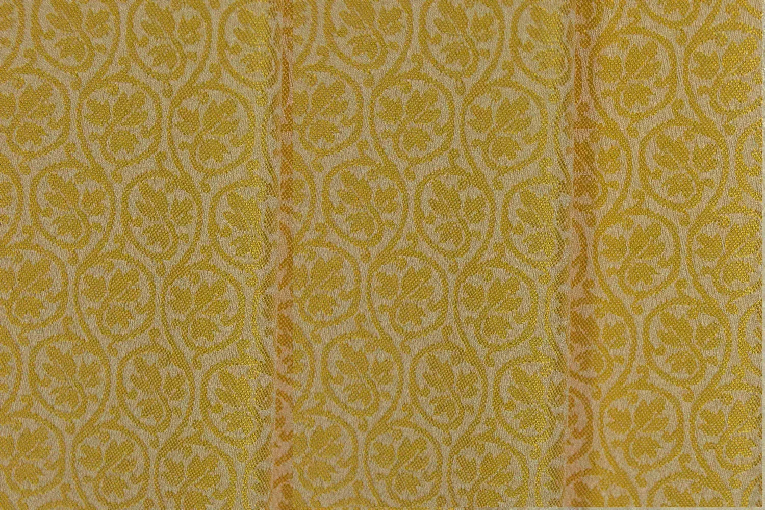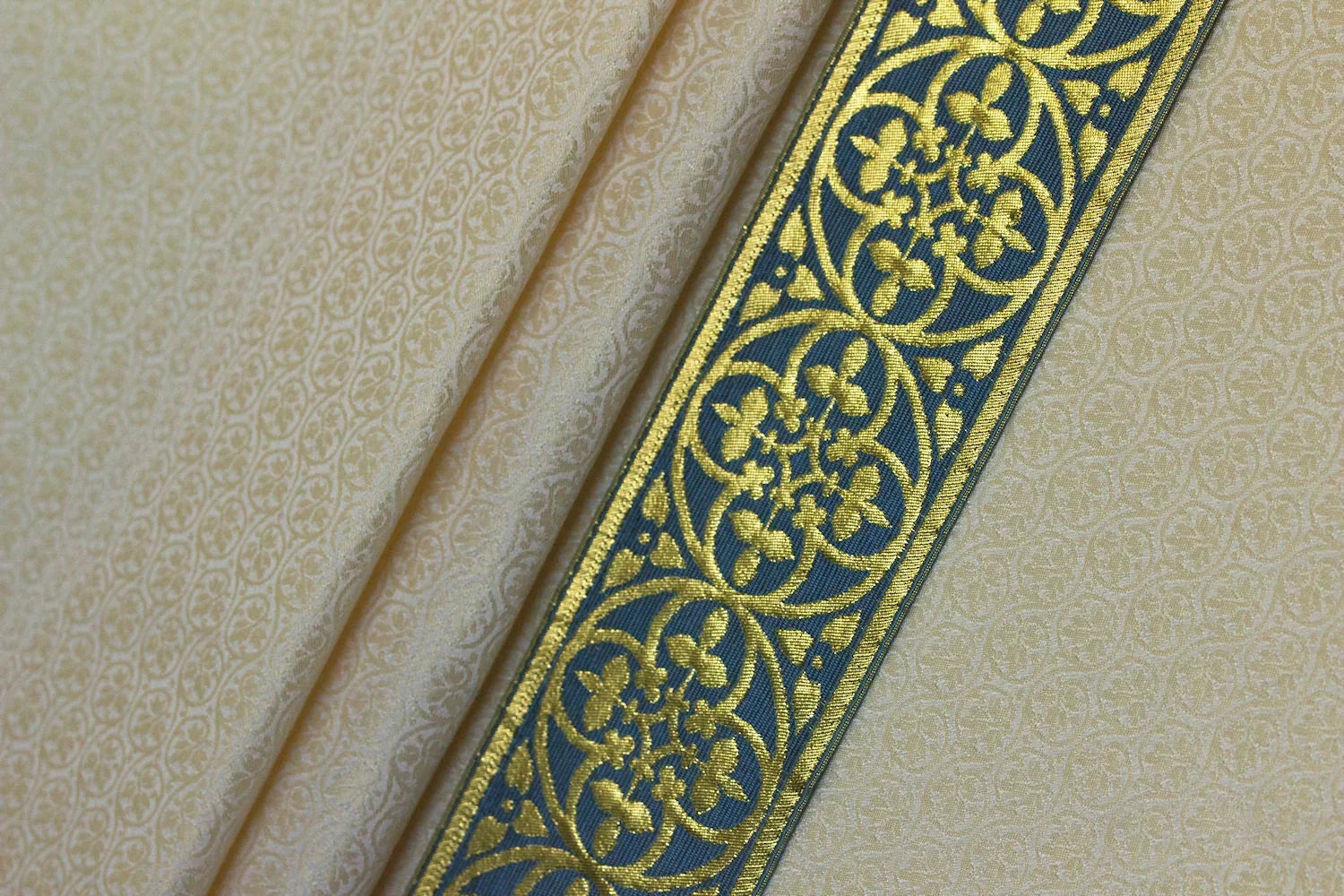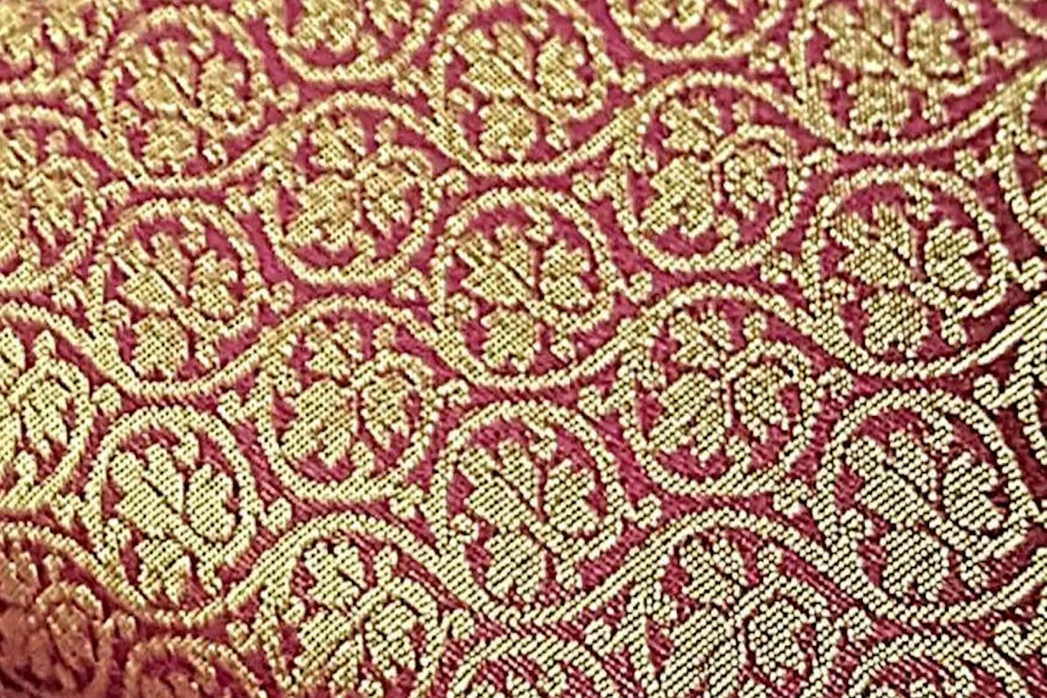 York Brocade is a small, yet elegantly designed liturgical church vestment fabric dating from the nineteenth century. It depicts a delicate scrolling Vine, which was an early symbol of the Eucharist. At 1 1/4" (3 cm), York Brocade has one of the smallest pattern repeats in this collection of Ecclesiastical Fabrics. Use the brocade fabric alone or as the base fabric, combined with solid colored accents or bolder fabrics with larger scale designs. York would also work well as the orphrey or trim on either solid colored fabrics or on bolder designs. Let your imagination loose to see what options might exist for your next church vestment project.*