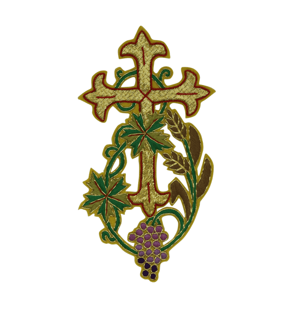 Latin Style Cross Appliqué with Wheat, Vine, and Grape Motif 4"W x 7"L for Church Vestments and Artistic Embellishments