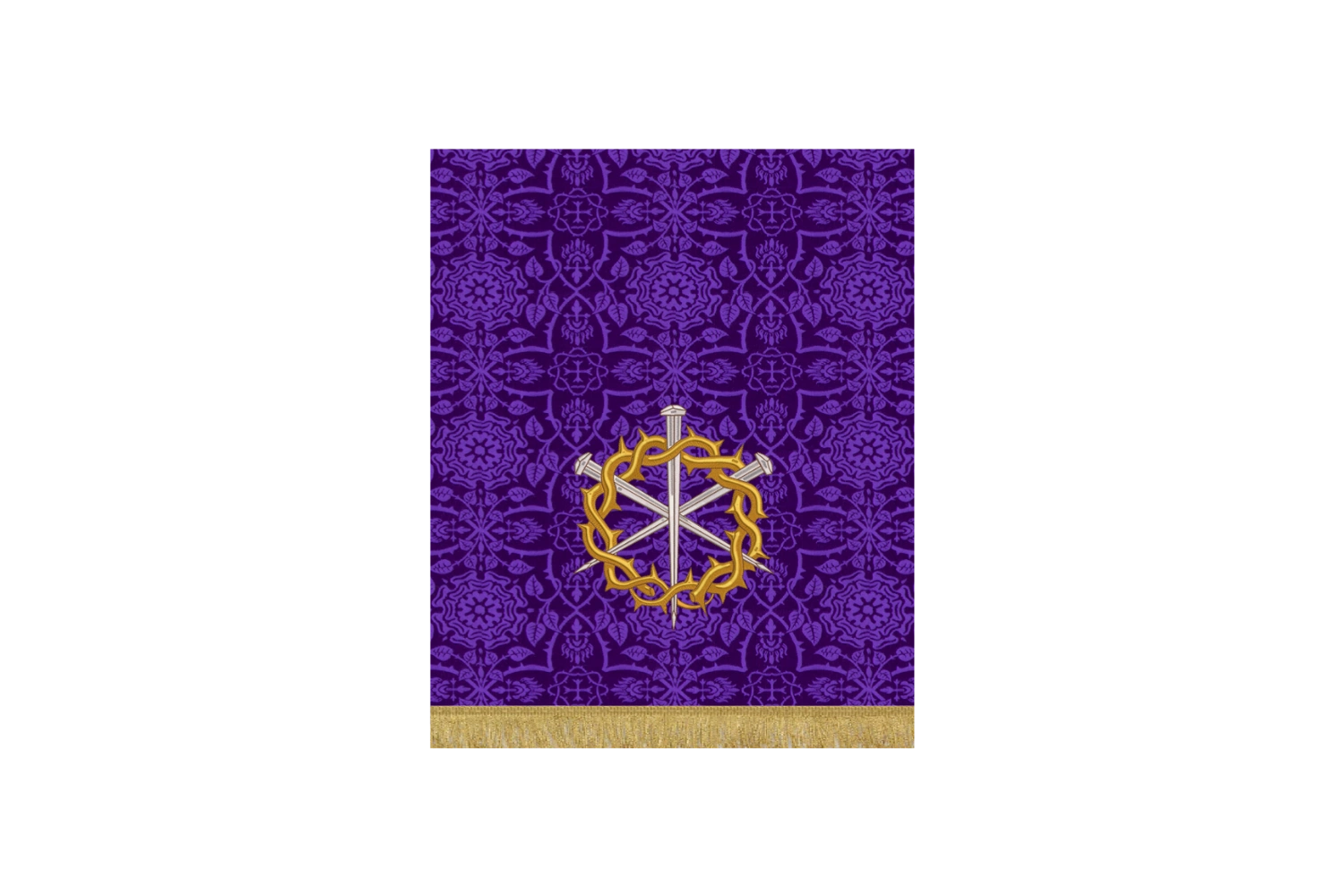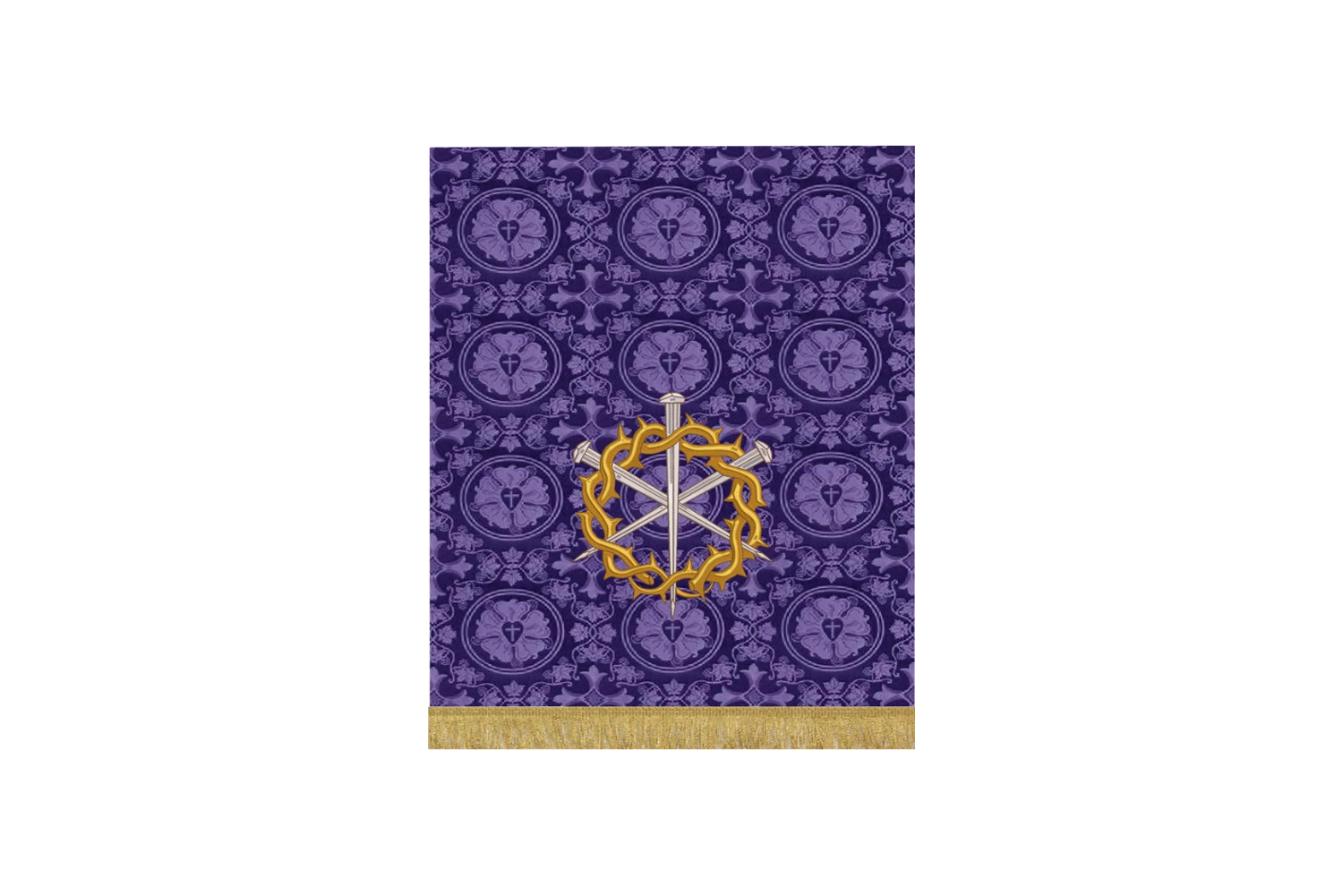 This violet brocade Lent pulpit fall features a powerful embroidered emblem of the Crown of Thorns intertwined with the Three Nails, a deeply moving symbol of the Passion of Christ. The Crown of Thorns—woven with sharp, piercing branches—recalls the suffering Jesus willingly endured, while the three nails represent the Crucifixion: hands, feet, and complete self-offering for the salvation of the world.
