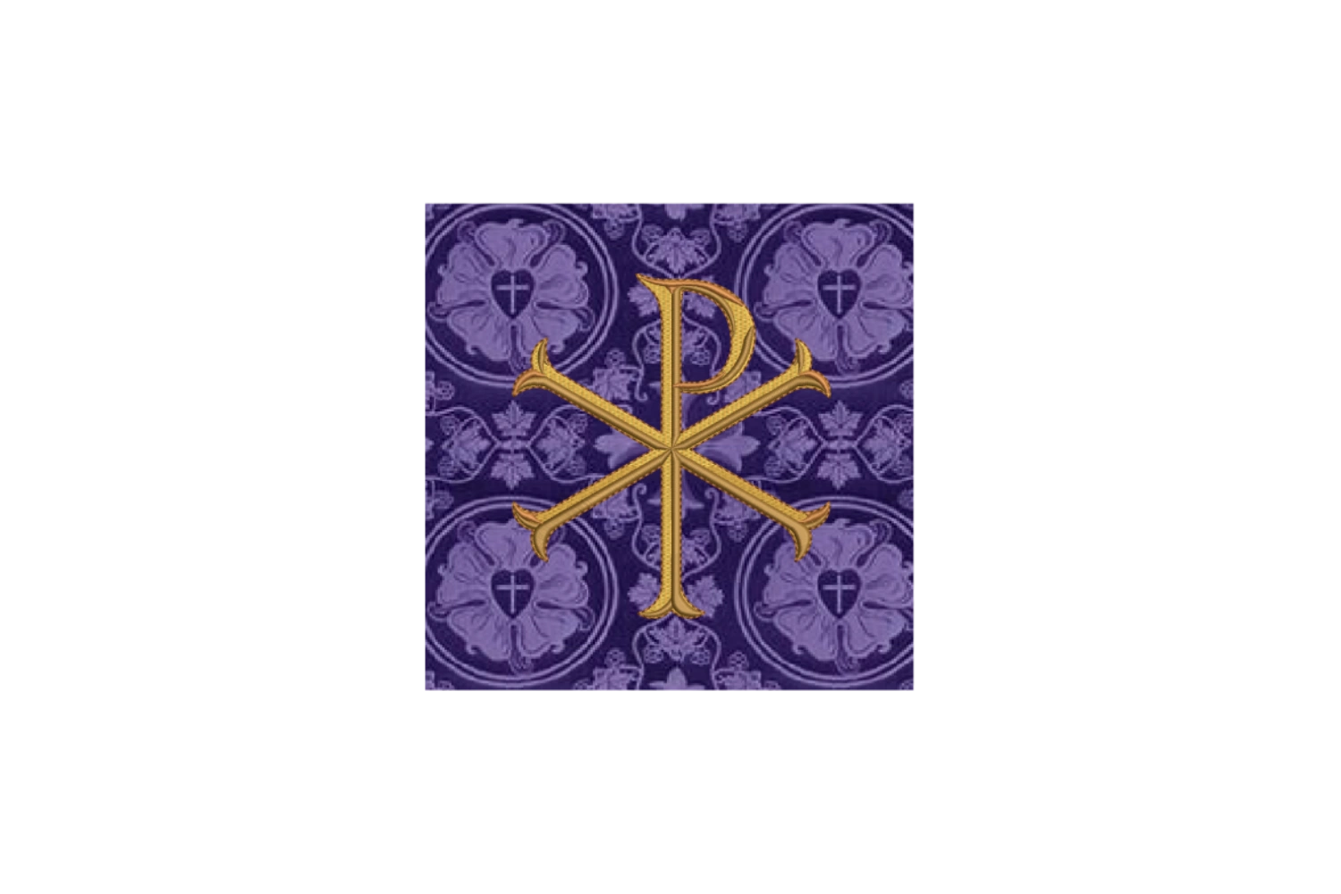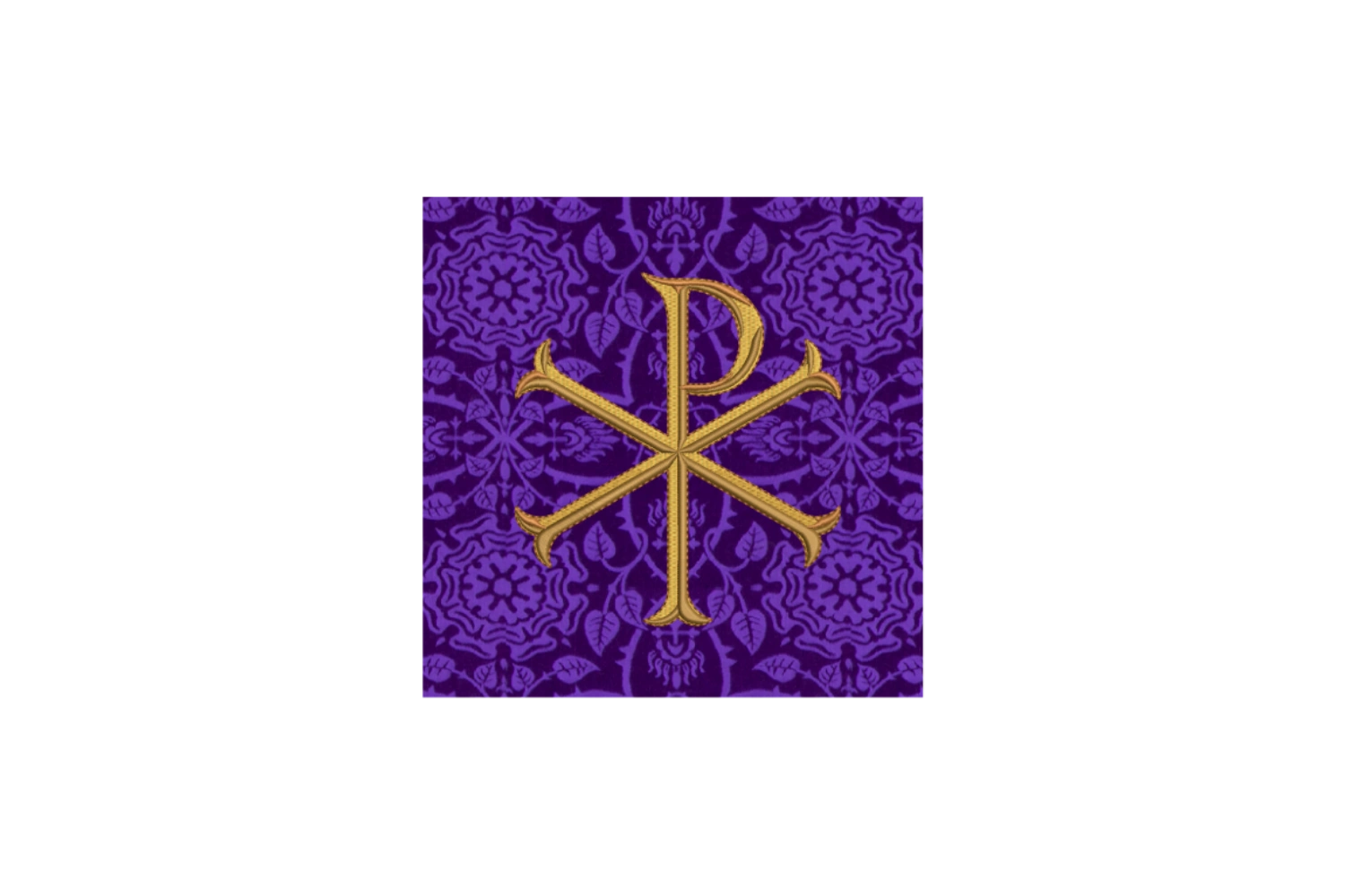 This violet brocade chalice burse features the ancient Chi Rho Christogram, one of the earliest symbols for the Name of Christ. The Chi (Χ) and Rho (Ρ) — the first two letters of Christos (Χριστός) in Greek — proclaim Jesus as the Anointed One, the Savior, and King.