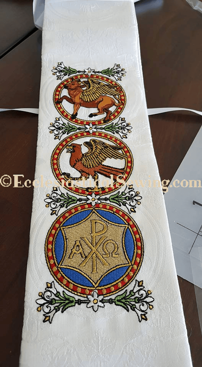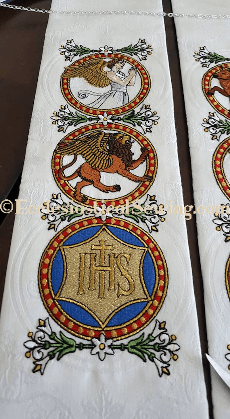 The White Evangelist Priest Stole Style #206 from the Evangelist Collection embodies the powerful vision of Ezekiel's "four living beings." Made with intricate embroidery, the images of the winged man, lion, ox, and eagle symbols bring a vivid recreation to life. This stole is perfect for those love rich historic symbolism. The designs are from Carrie's personal historic collection of vintage embroidery books.