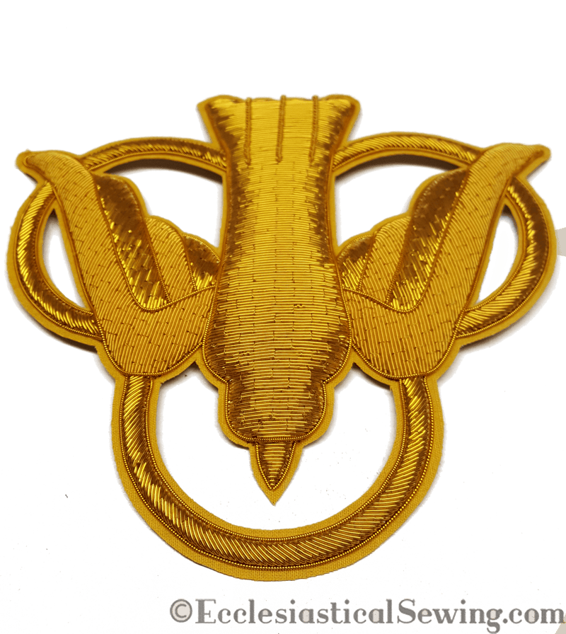 Design is hand appliqued to vestment using Imitation Japanese Gold Thread or Gold Twist.