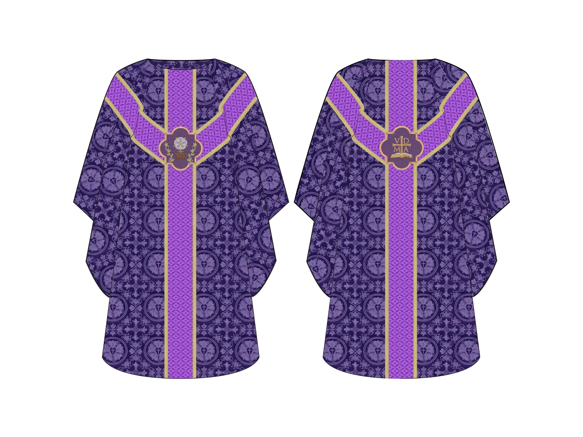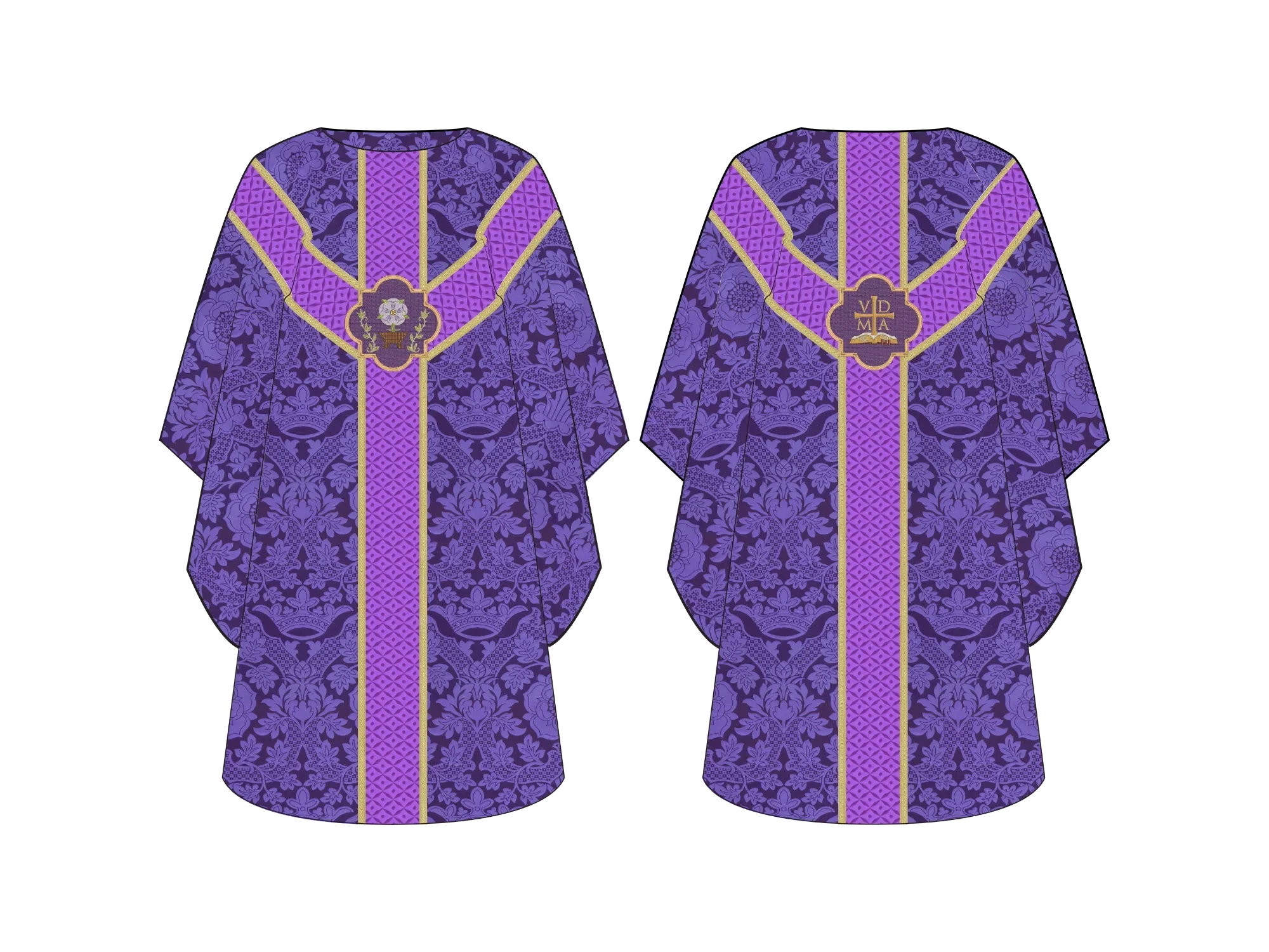 Rich Violet or Blue Chasuble for Advent with Y contrasting Y orphrey bands on the front and back. Applique accents of Messianic Rose Manger and VDMA Bible.