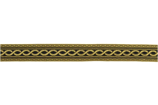 St. Benet is a scroll design trim available a  3/4" size. This is a rayon version of St. Benet trim. This allows for a muted and subtle look. St. Benet is a striking complement to many fabrics, including Fairford, St. Margaret, and the two-tone colored fabrics.