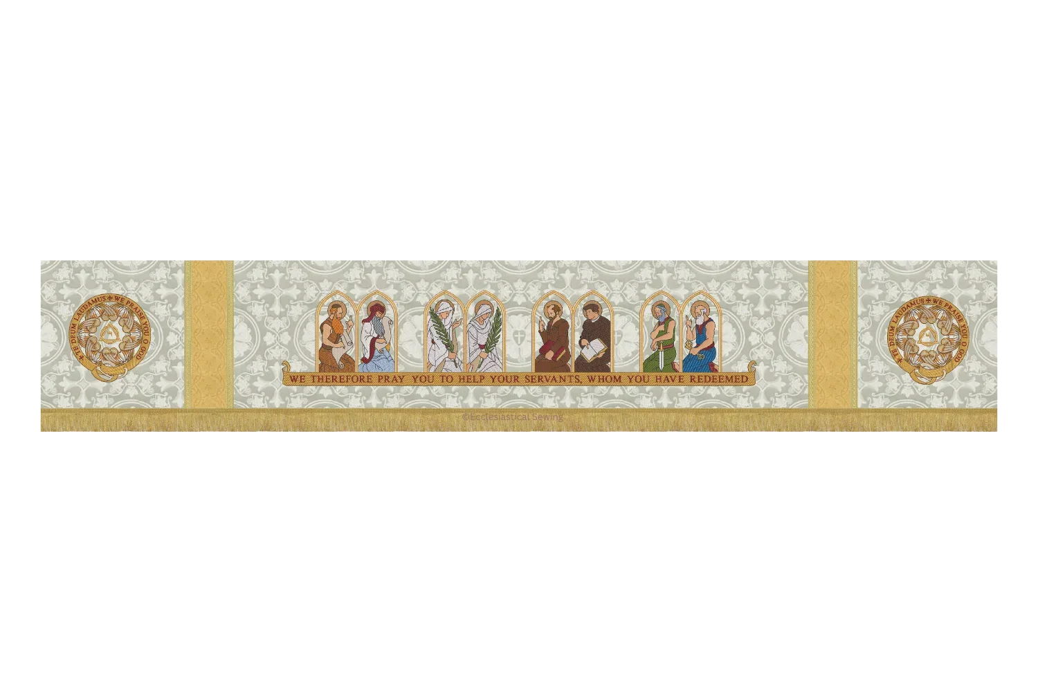 Design inspiration and text for this set comes from the Te Deum. "We therefore pray you to help your servants whom you have redeemed." The design features Prophets Apostles, Saints and Martyrs. The superfrontal ends are adorned with Cloth of Gold orphrey bands and the Te Deum Laudumus design.