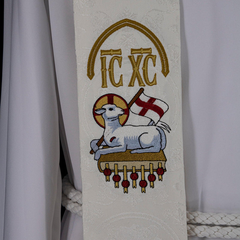 Elevate your holiday services with our White Clergy Stoles from the Christmas Rose Easter Collection! Made with delicate European Brocade, each stole features the Agnus Dei seated on a scroll with 7 Seals, a Messianic Rose and manger, and an Easter Cross with vines. Bring a touch of elegance and meaning to your Christmas and Easter services.