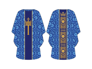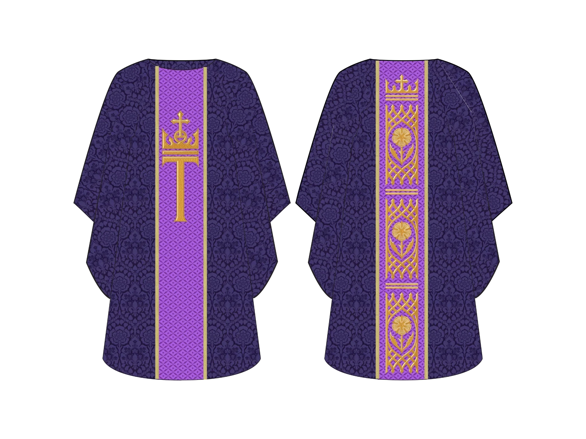 The Advent Tau chasuble is adorned with a Tau Cross with Crown Design on the front and a Lattice and Messianic Rose design on the chasuble back.