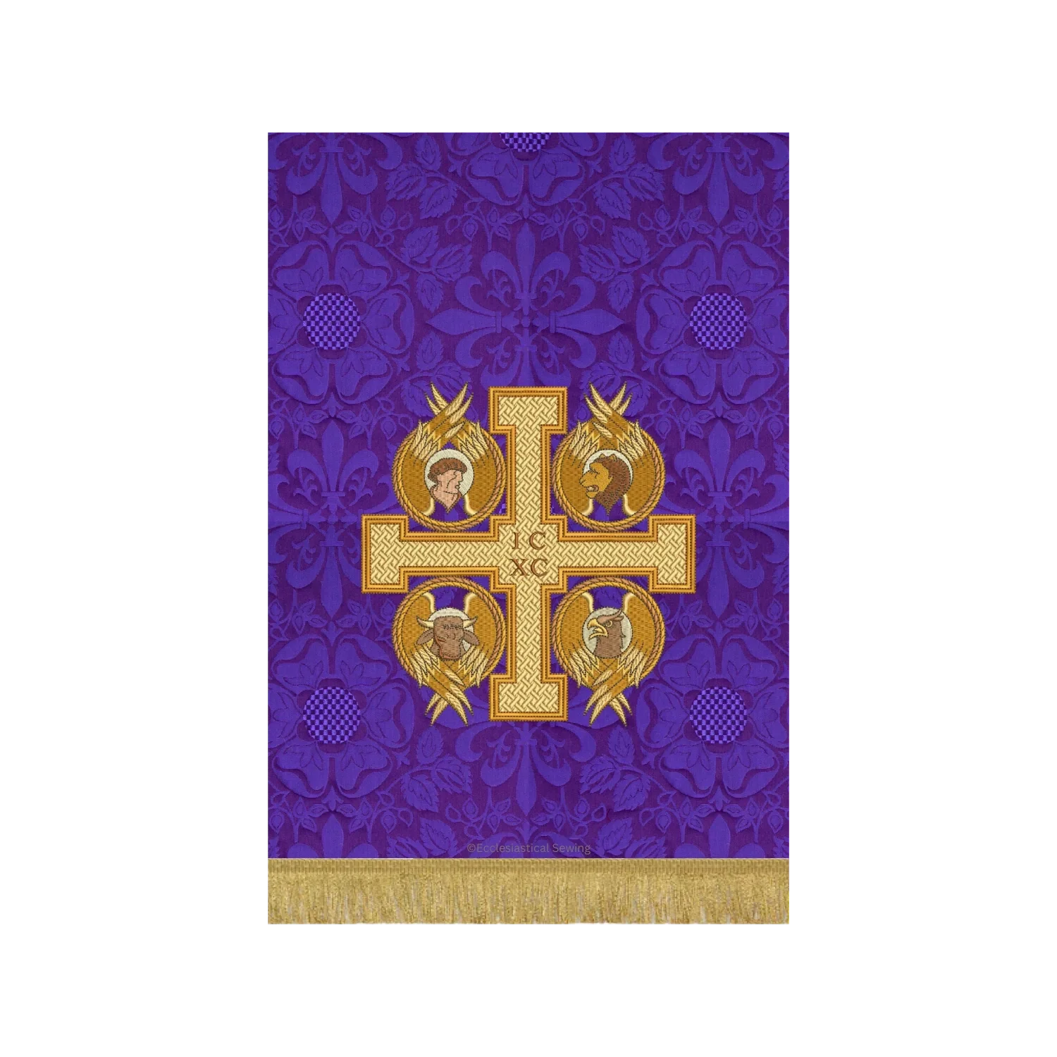 The Evangelist Lectern Fall in violet is a beautifully crafted piece for your worship space. It features the gold cross at the center, surrounded by the four Evangelists, each represented by their traditional symbols: Saint Matthew (winged man), Saint Mark (lion), Saint Luke (ox), and Saint John (eagle). These symbols are woven into circular medallions, highlighting the richness of Christian tradition.