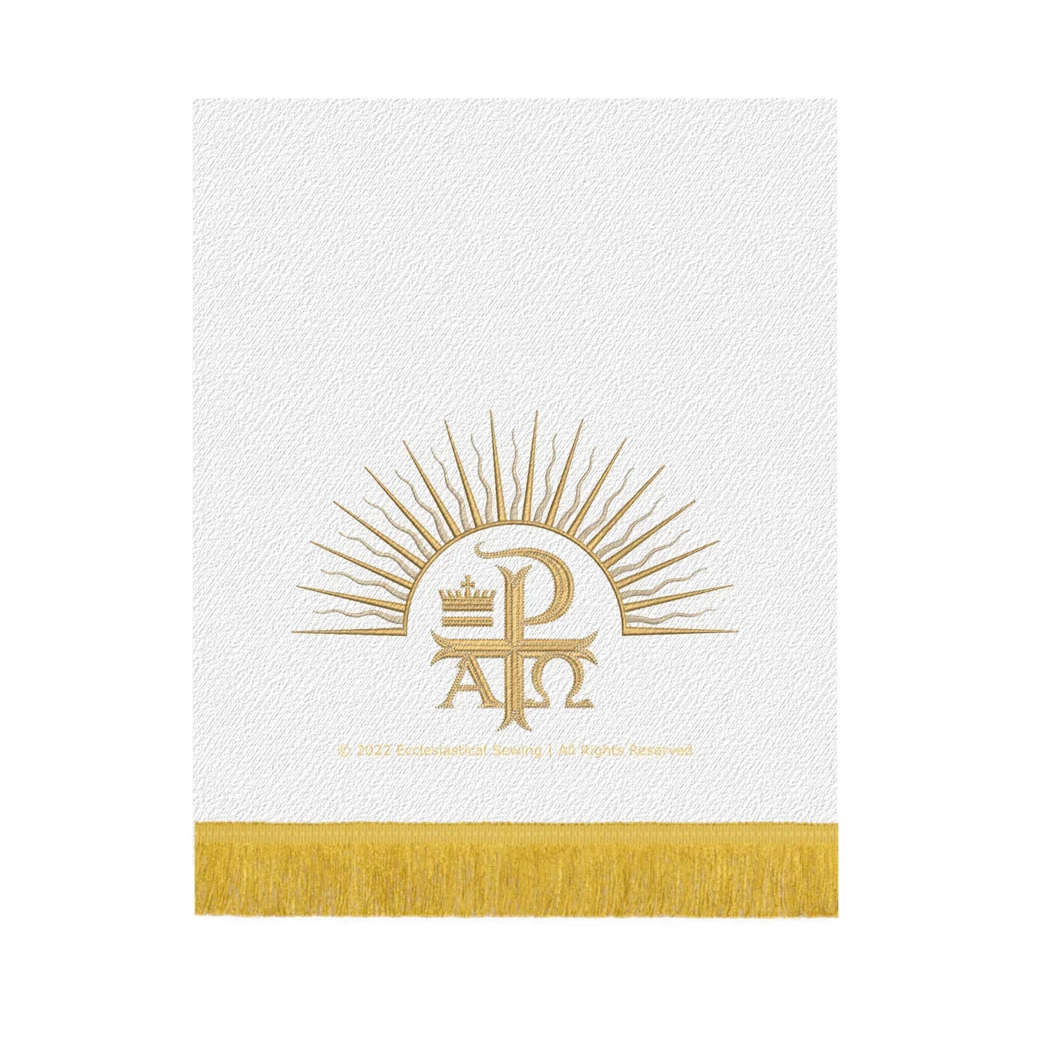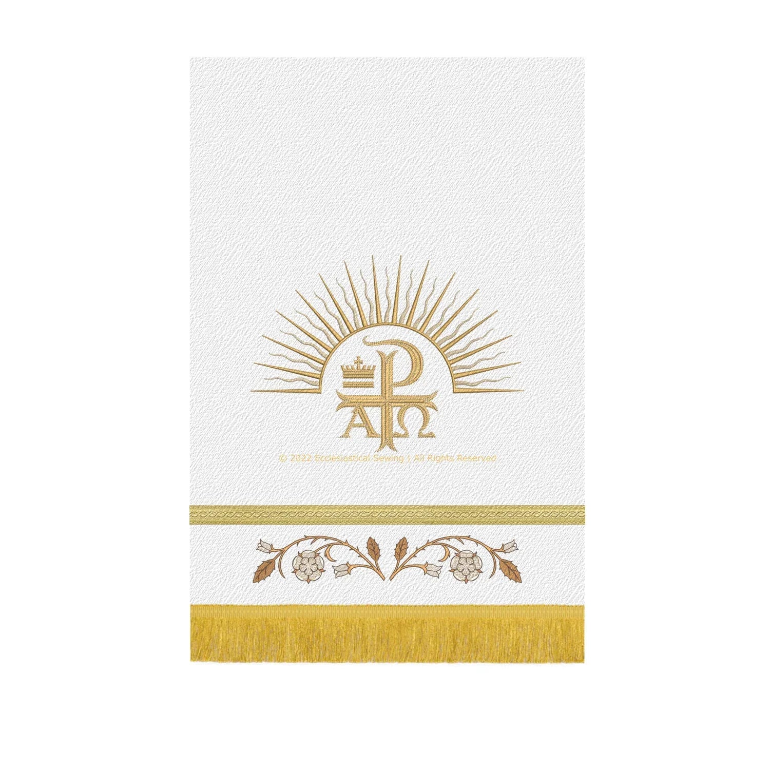 Realizzato con i migliori materiali e attenzione ai dettagli, questo pulpito è una vera opera d'arte. Il tessuto White Brocade è morbido e resistente, mentre il ricamo Dayspring in oro metallizzato aggiunge un tocco di lusso e raffinatezza al design. Il design Dayspring presenta un sole nascente, "Il Signore è la mia luce e la mia salvezza", che lo rende un'aggiunta significativa e stimolante alla tua chiesa.