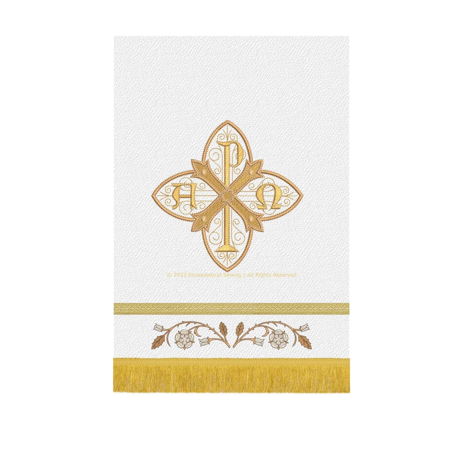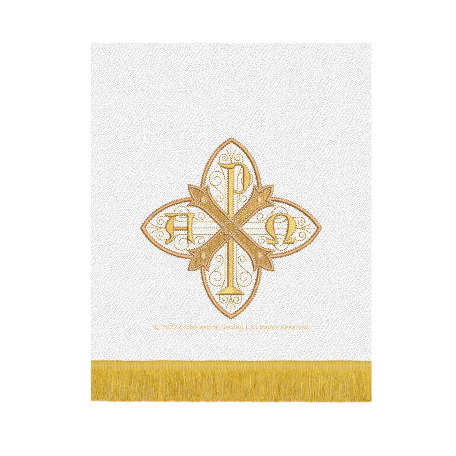 Realizzata con i migliori materiali e attenzione ai dettagli, questa caduta del pulpito è una vera opera d'arte. Il tessuto in broccato bianco è morbido e resistente, mentre il ricamo in oro metallizzato aggiunge un tocco di lusso e raffinatezza al design. Il simbolo Chi Rho, che rappresenta Cristo, è ben visibile al centro della caduta, rendendolo un'aggiunta significativa e stimolante alla tua chiesa.