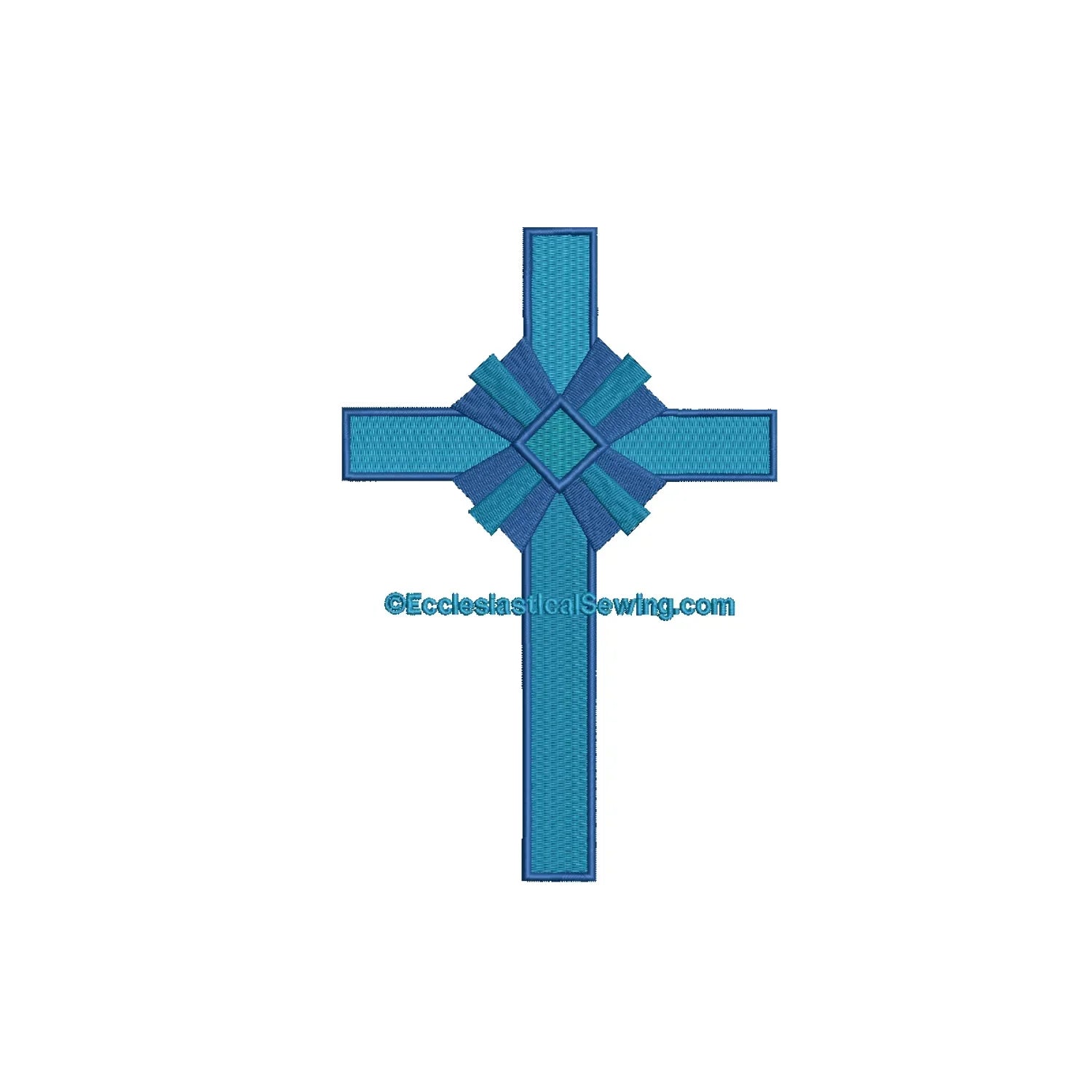 Disegno di ricamo a croce in vetro colorato. Questo disegno di ricamo a macchina religioso è lavorato con fili blu. Sembrerebbe altrettanto sbalorditivo con fili rossi o dorati.