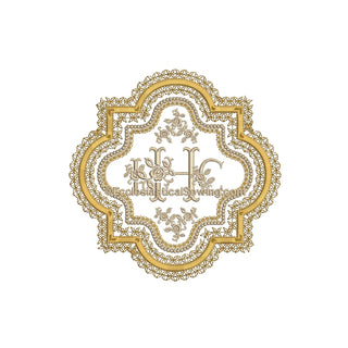 Un delicato disegno di ricamo a macchina in oro aggiunge un bel tocco vintage a paramenti e arazzi d'altare e biancheria d'altare. Il disegno è mostrato con fili d'oro ma può essere facilmente cucito in tinta unita come il bianco. Usa il monogramma fornito o sostituisci il tuo disegno al centro.