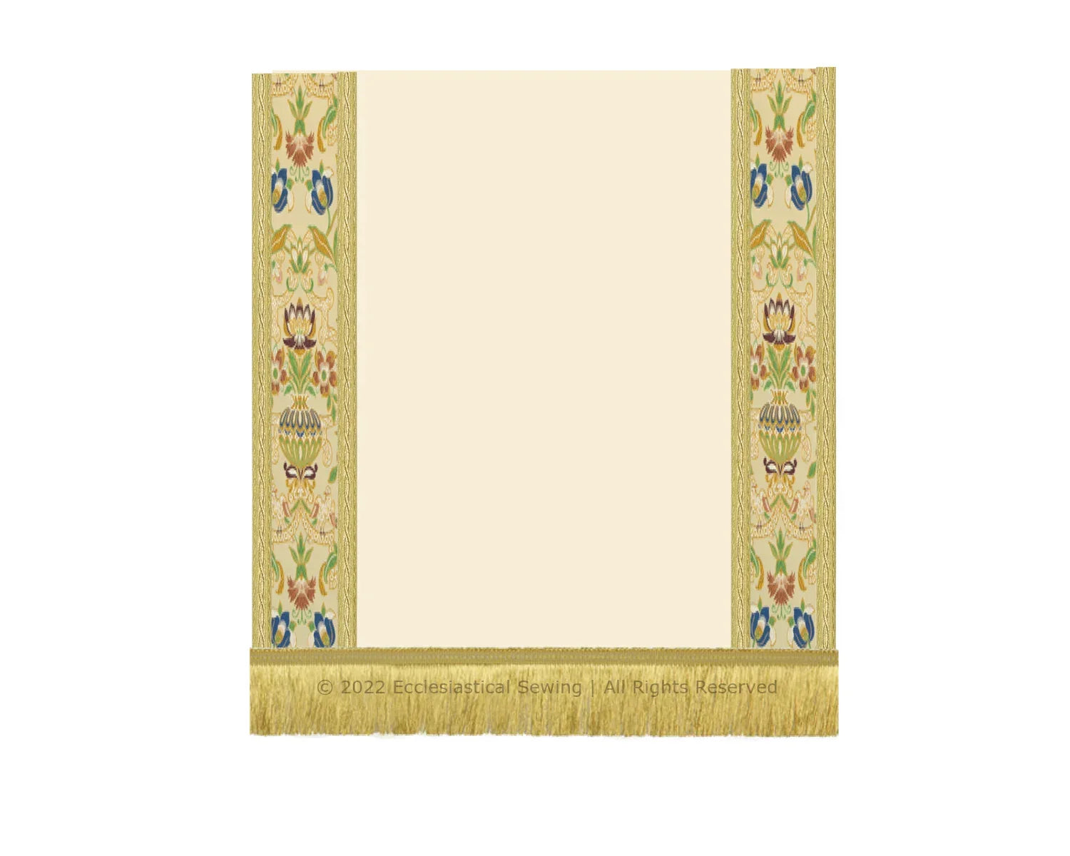 Poiché ogni set è realizzato a mano uno alla volta, ti chiediamo di consentire un tempo di consegna dell'ordine da 6 a 12 settimane. Sono disponibili articoli aggiuntivi come il velo del calice, la borsa, la casula, la stola, la stola del diacono, il frontale dell'altare o il superfrontale.