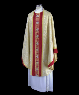 Questa casula è nella nostra collezione di San Tommaso. Questo set presenta una casula monastica creata utilizzando l'elegante tessuto broccato St. Margaret Ivory e Lurex. Tessuto in un ricco colore avorio St. Margaret ha un sottile luccichio dai fili di Lurex intrecciati in tutto il motivo. Questo è un tessuto unico nel suo genere che è uno dei preferiti. La casula presenta accenti di design di una colonna orphrey sia per la parte anteriore che per quella posteriore in un dupioni di seta rosso intenso e Red Pugin Orphrey con bordo Galloon. La casula ha "rifiniture con dettagli sulle maniche" anch'esse realizzate con dupioni di seta e rifiniture di galloon.