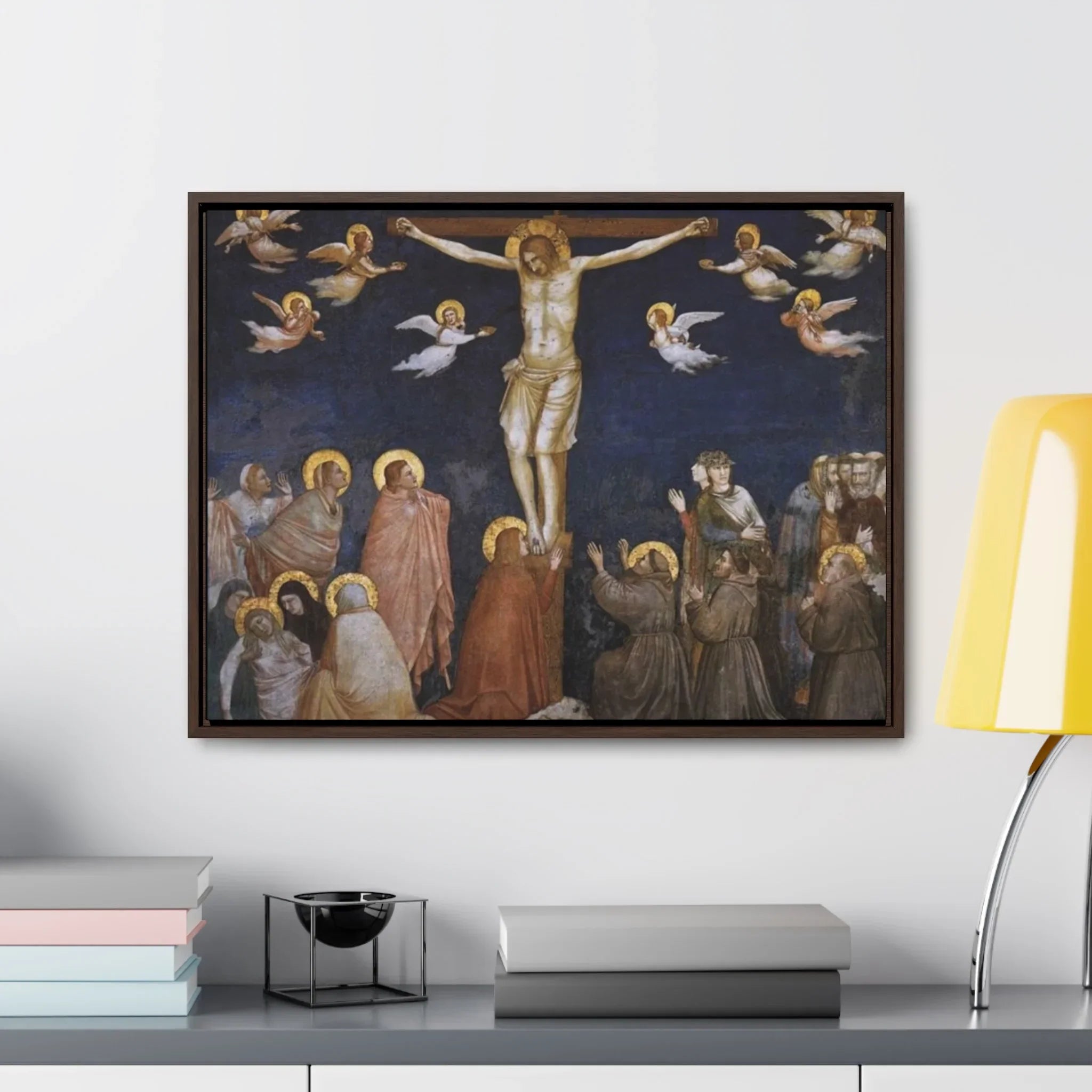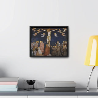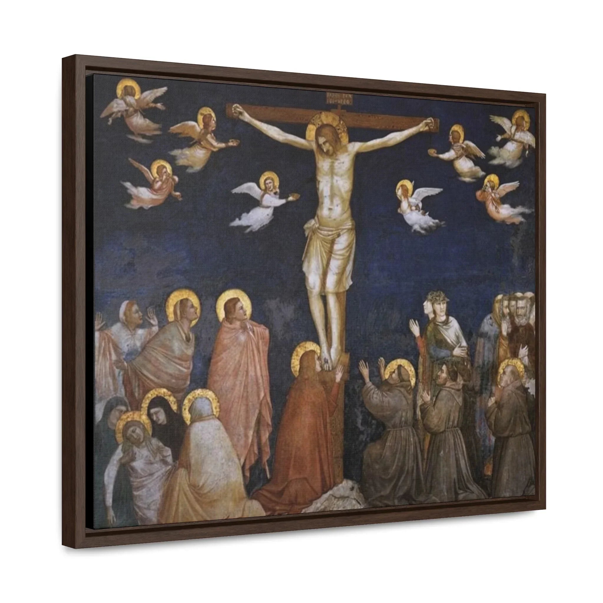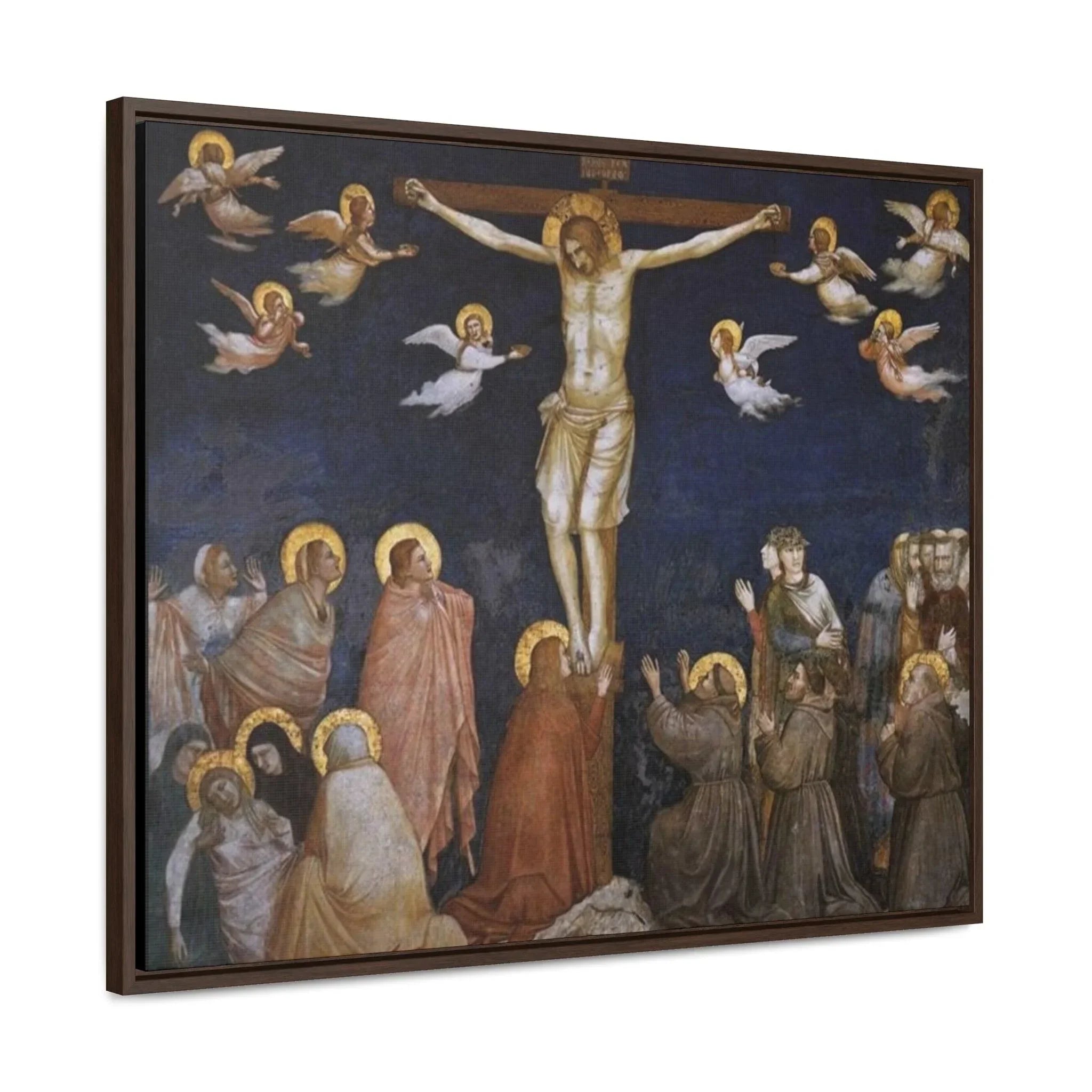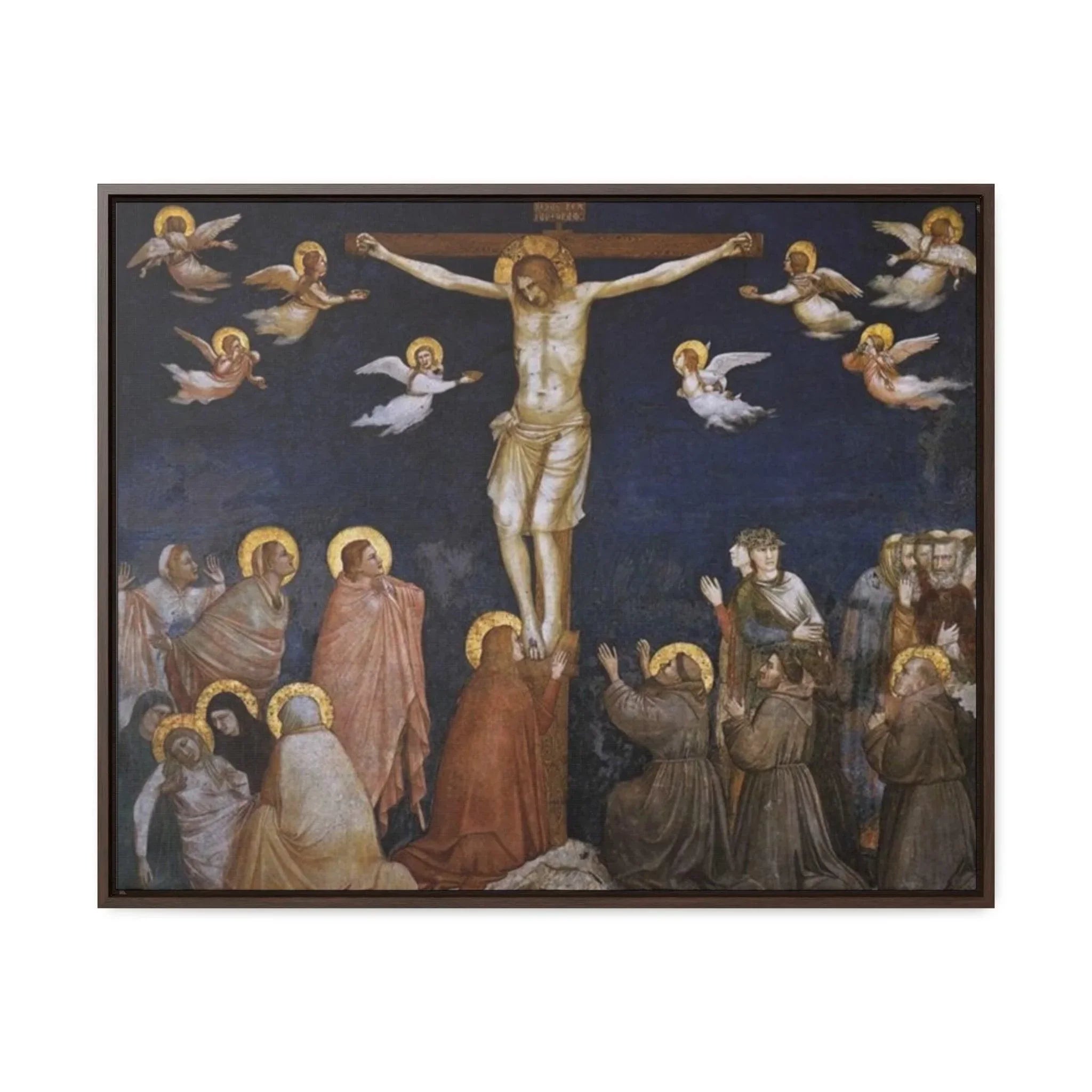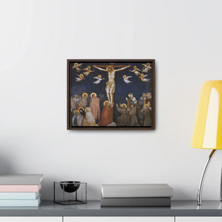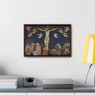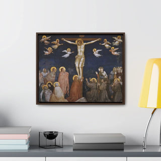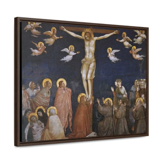 The artwork "Giotto The Crucifixion," created between approximately 1311 and 1320, is a powerful and poignant depiction of the crucifixion of Jesus Christ. In this masterpiece by the Italian artist Giotto di Bondone, the figure of Christ is portrayed on the cross, surrounded by mournful figures and witnessing disciples. Giotto's use of striking colors and dramatic composition conveys the emotional intensity of the moment, capturing the solemnity and gravity of Christ's sacrifice. The artwork shows a sense of sorrow and reverence, inviting viewers to reflect on the central event of the Christian faith and the message of redemption.