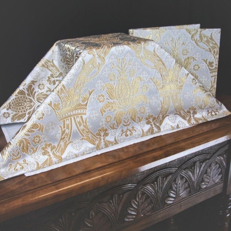 Il broccato metallico bianco e oro è un bel motivo con motivi di melograno e corona.