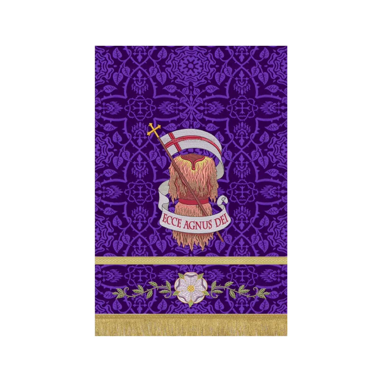 Introducing the awe-inspiring church pulpit fall adorned with an exquisite embroidery design of the iconic camel hair garment of St. John the Baptist. This meticulously crafted piece serves as a powerful symbol of  Advent or Lent with the Ecce Agnus Dei - Behold, the Lamb of God message, enhancing the sacred atmosphere of any worship space.