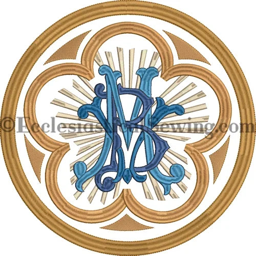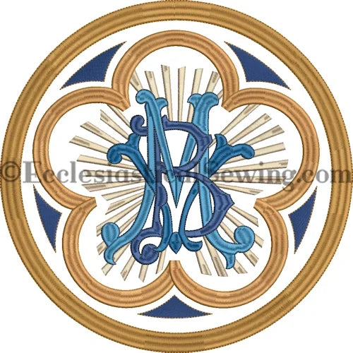 The Blessed Virgin Mary Quatrefoil Machine Embroidery Design is a classic church monogram, making it the perfect option for use on a liturgical vestment. This religious machine embroidery design is worked in Various shades of blue, gold and rose threads. The design is available in 6" and 9" sizes for use on vestments such as pulpit falls, chasubles, and altar frontals.
