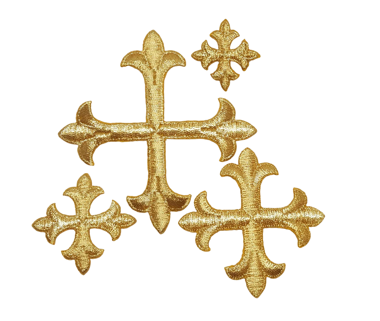 Small iron on cross appliques are useful when time is tight and a cross is needed to adorn the back neckline of a stole, or to adorn a burse, chalice veil, stole front, or other liturgical item. The crosses are embroidered appliques with an iron on backing.