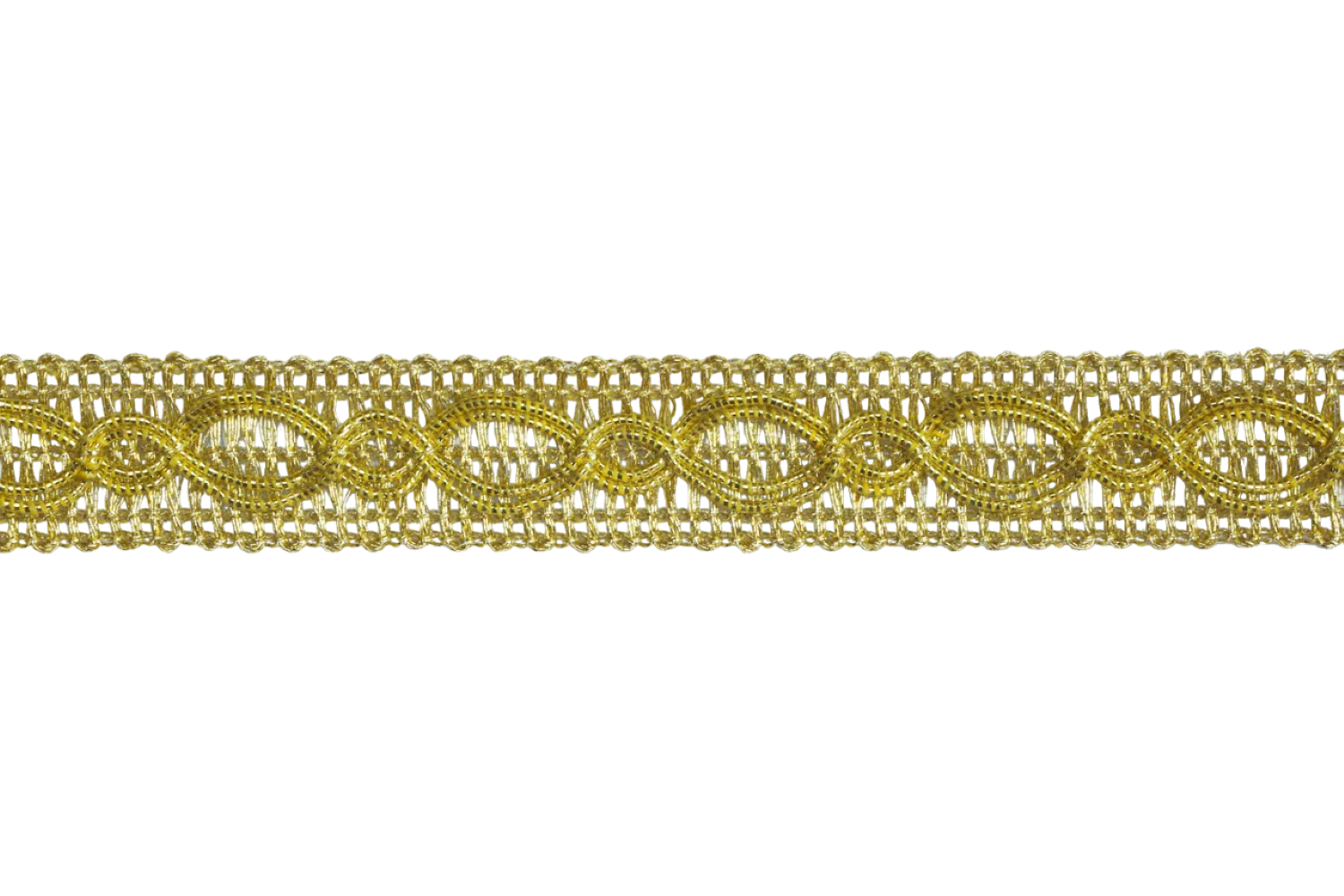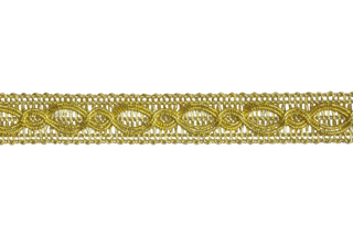 Gold Chain Braid is a slightly open metallic trim with a lighter, airier look. The color works with a wide range of projects, including restoration projects. This is a flexible trim that would work well for curved edges of chasubles.