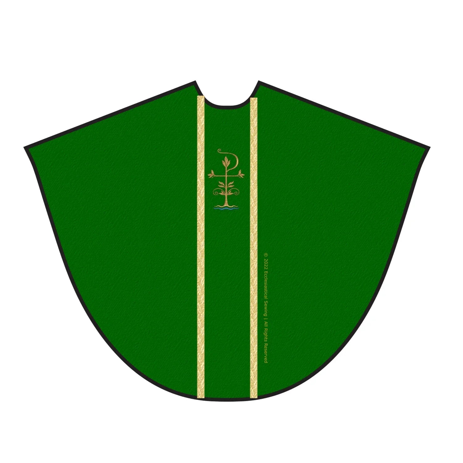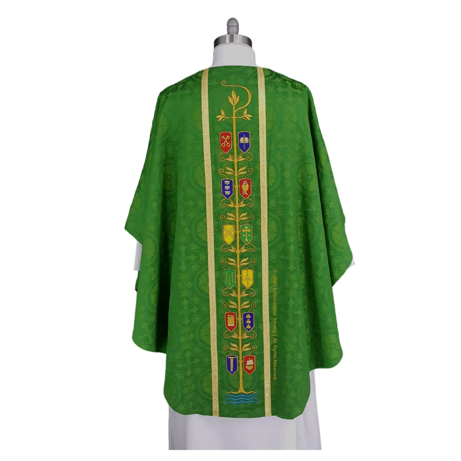 The chasuble back has the Chi Rho Tree with the Symbols of the Apostles. The front has the smaller Chi Rho Tree.