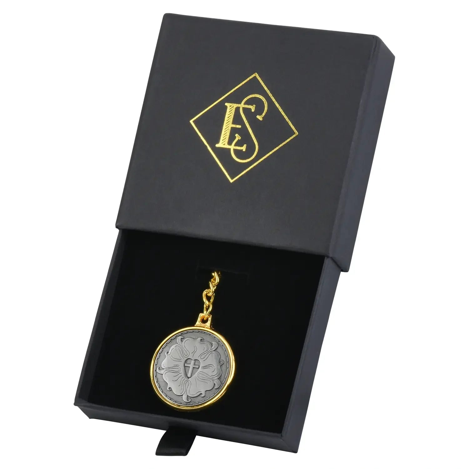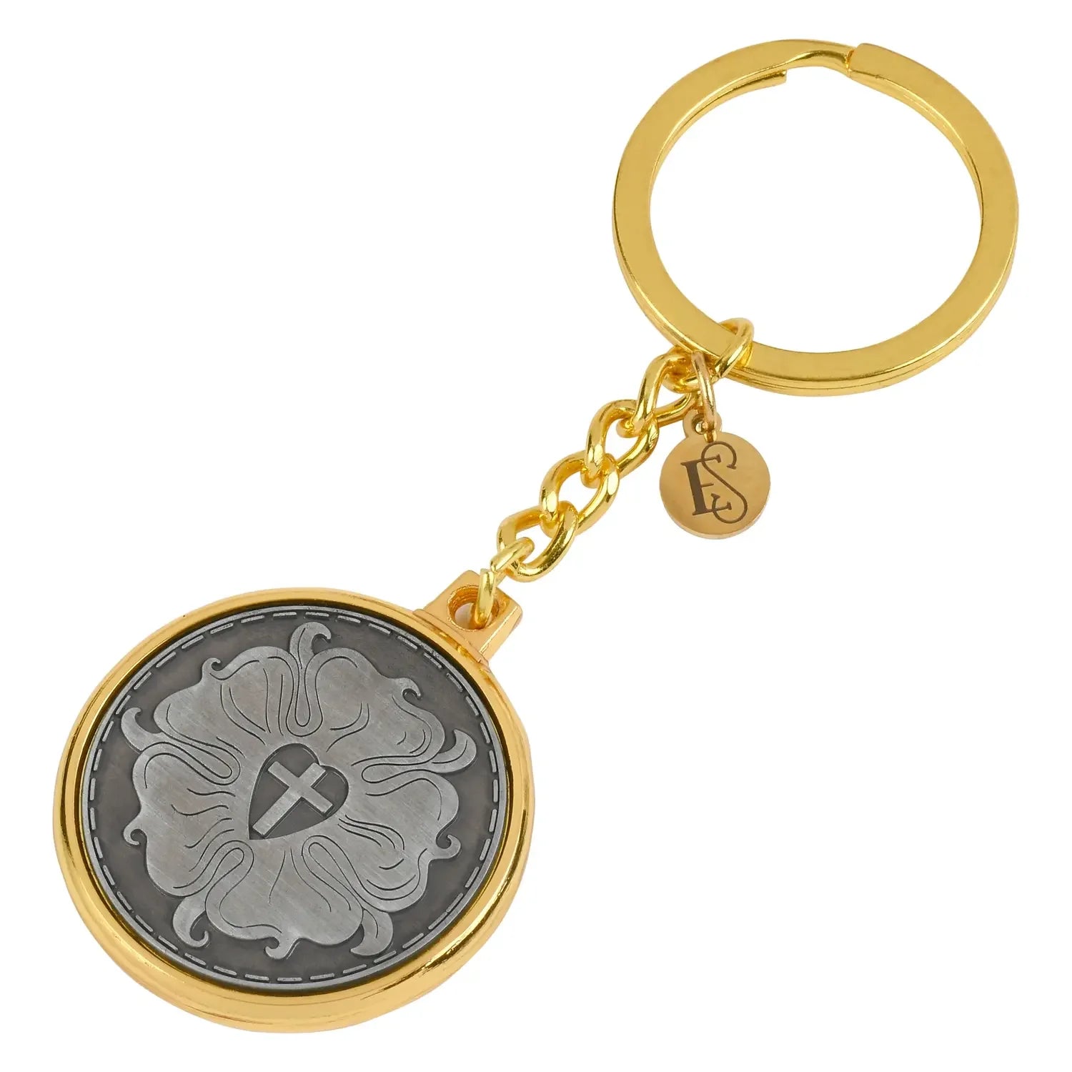 Introducing our Luther Rose VDMA Key Chain, a beautifully crafted accessory that combines history, faith, and timeless design. This exclusive piece was meticulously designed by the founder of Ecclesiastical Sewing, who drew inspiration from an extensive collection of historical books on church vestments, embroidery, and sacred symbols. The result is a one-of-a-kind key chain that reflects the rich heritage of the Lutheran tradition.