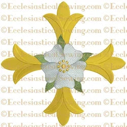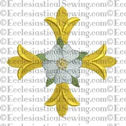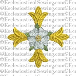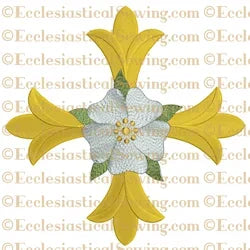 This Patonce Cross Rose is worked with a variety of satin stitches and fill stitches perfectly designed to accent the shape of this beautiful cross. The design features trifurcated limbs which are reminiscent of a leaf shape. The Patonce Cross may be worked in gold metallic embroidery threads. Placed over the center of the Patonce Cross is a lovely Tudor or Messianic Rose. The fulfillment of the promised Savior comes to us through the cross.