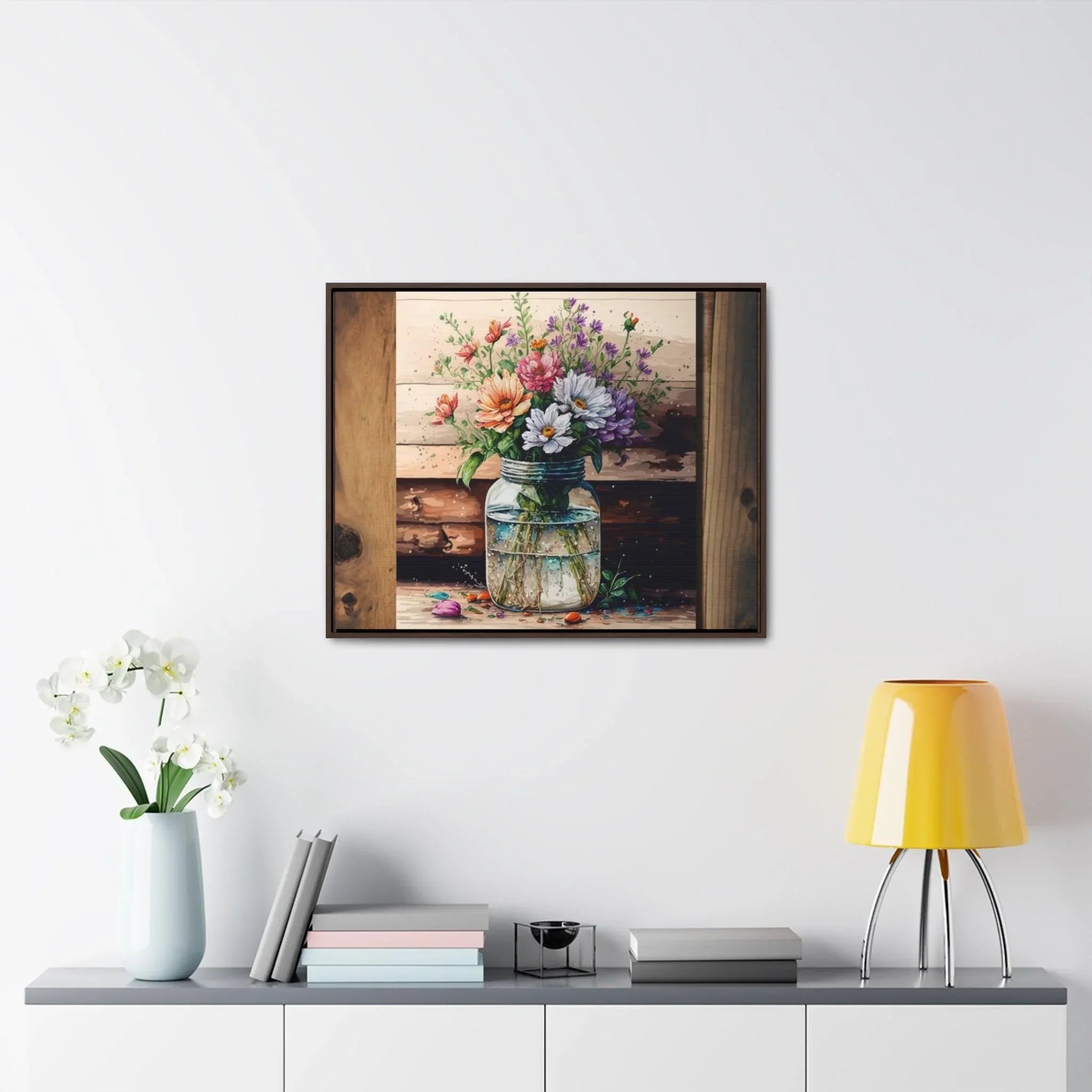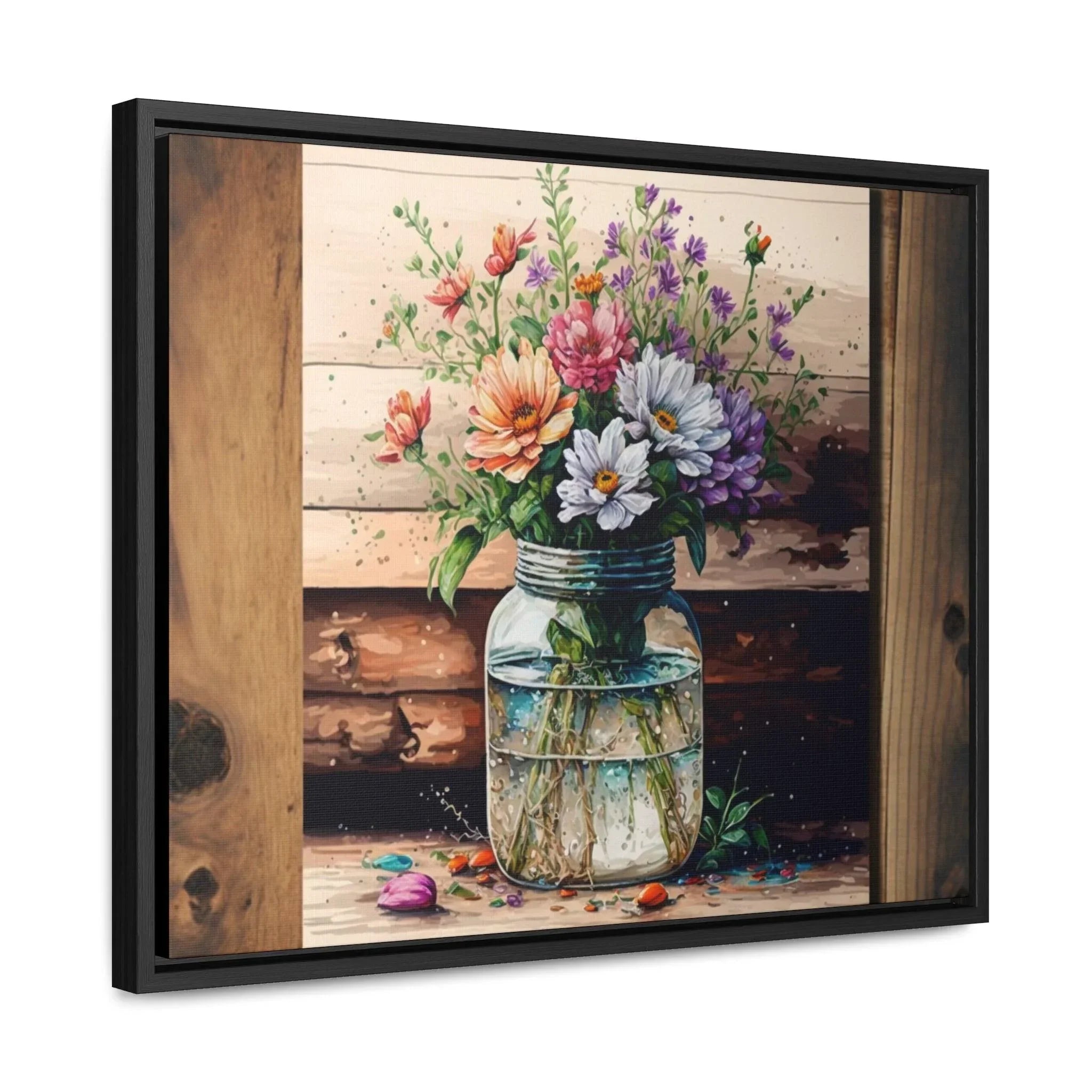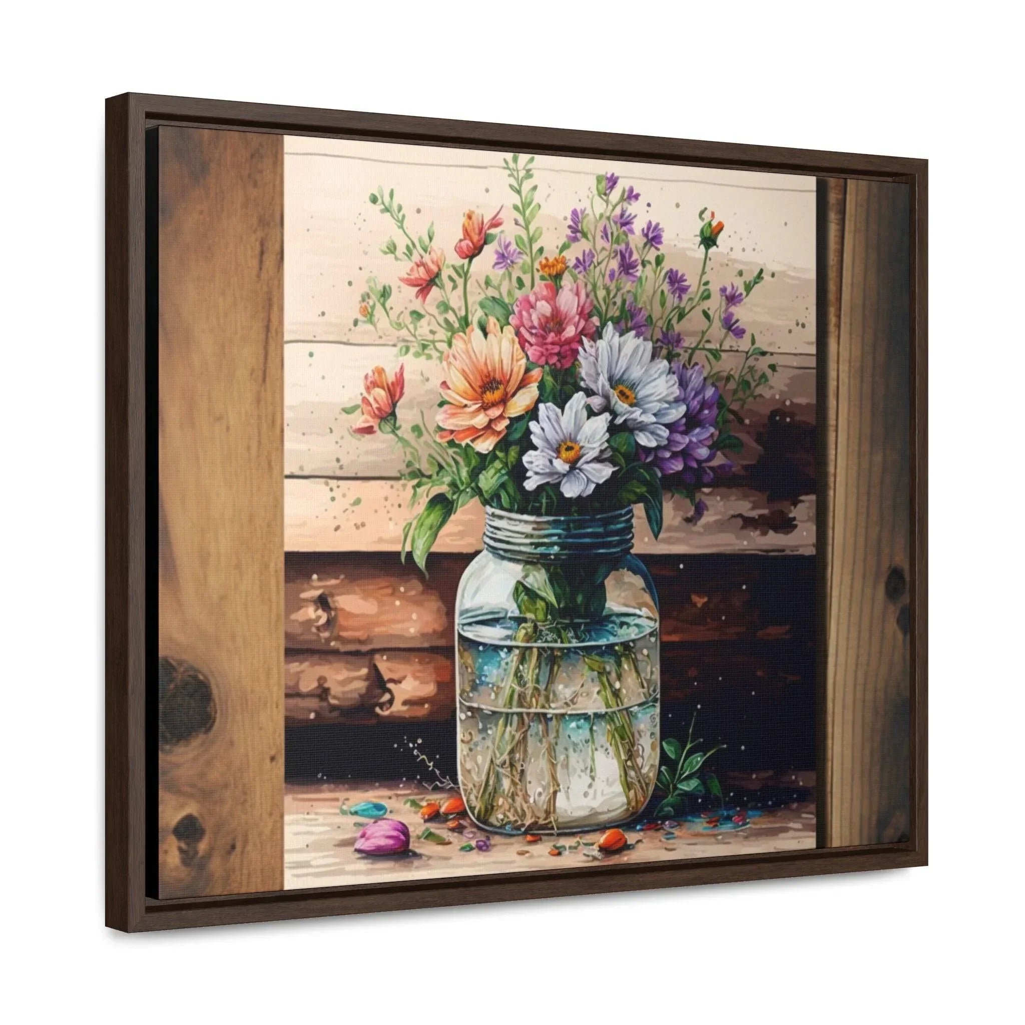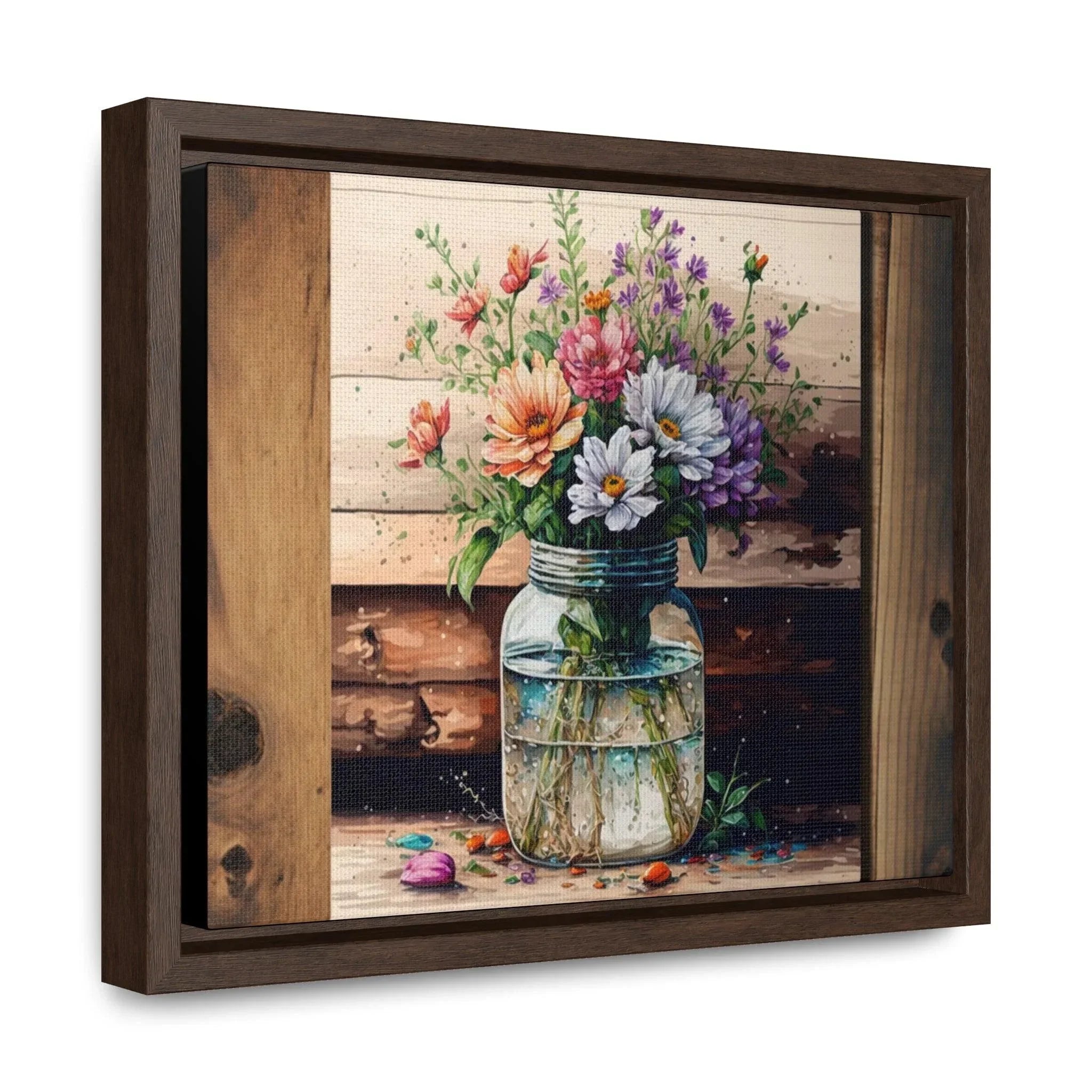 Rustic Beauty: Mason Jar Floral Watercolor Print on Canvas Experience the beauty of rustic decor with this enchanting watercolor print of a mason jar filled with vibrant flowers. The print is expertly reproduced on high-quality canvas, giving it a textured and lifelike appearance. The natural subject matter and rustic color palette make it a perfect addition to any room in need of a touch of nature. Whether you're looking for a unique piece of art for your living room, bedroom, or kitchen, this print is sure to please. Perfect for gifting or for your own home, this print is a must-have for any lover of rustic charm. Buy the beautiful print for yourself or give it as a gift.
