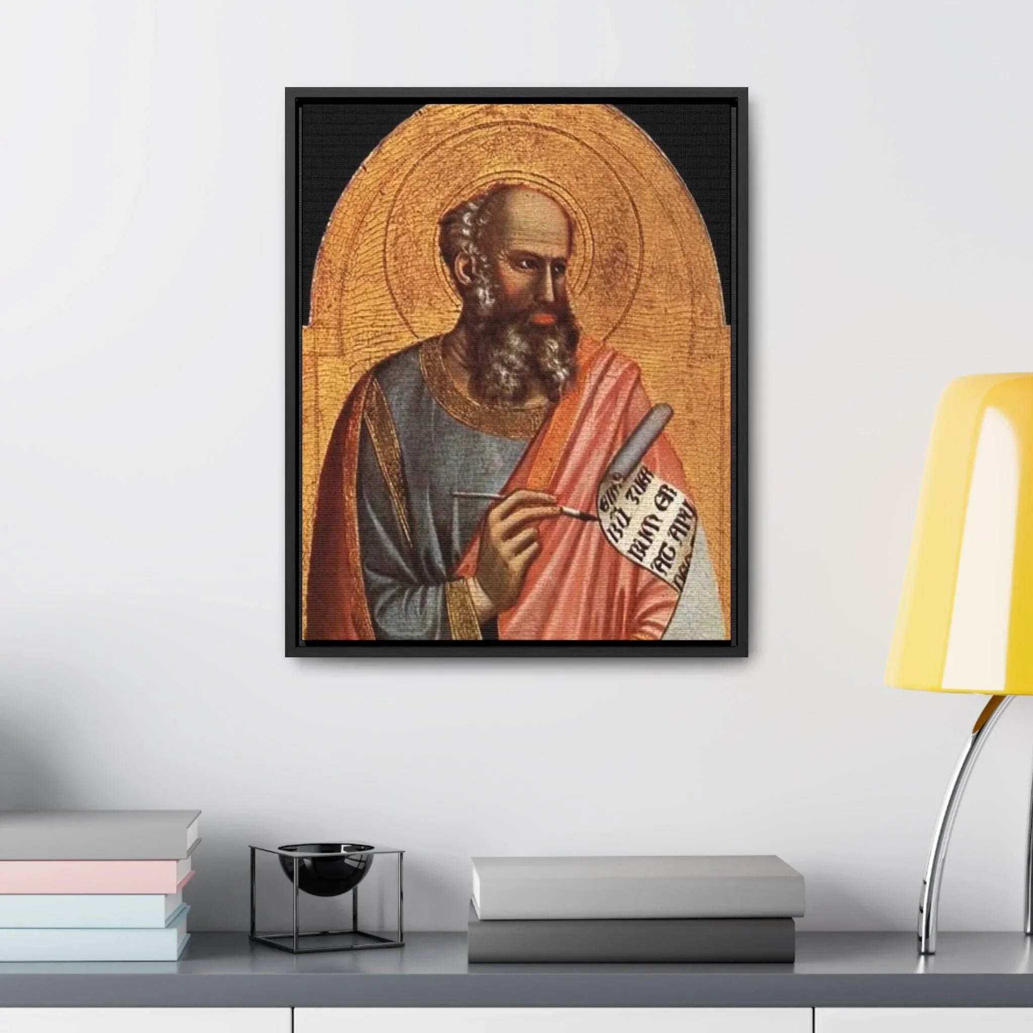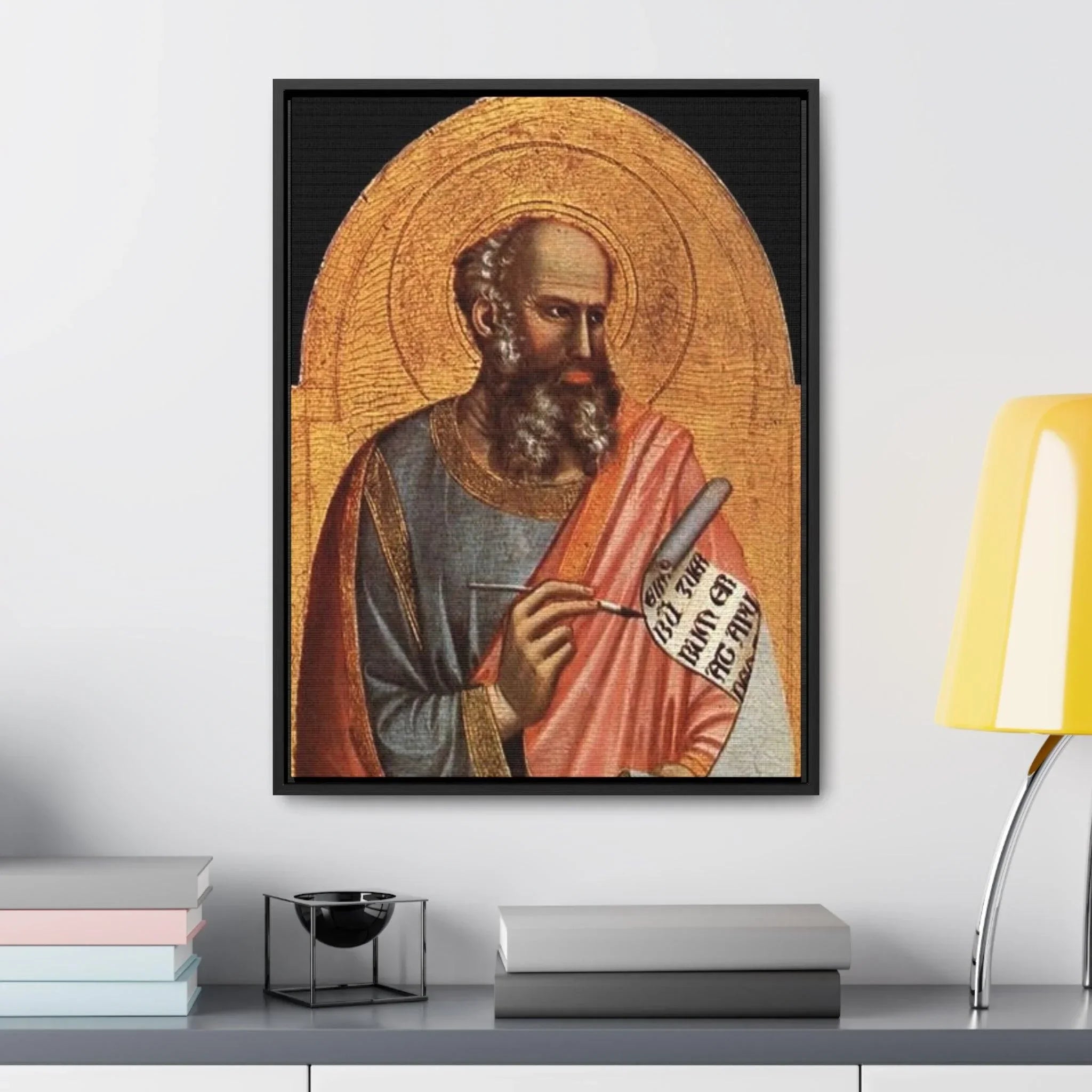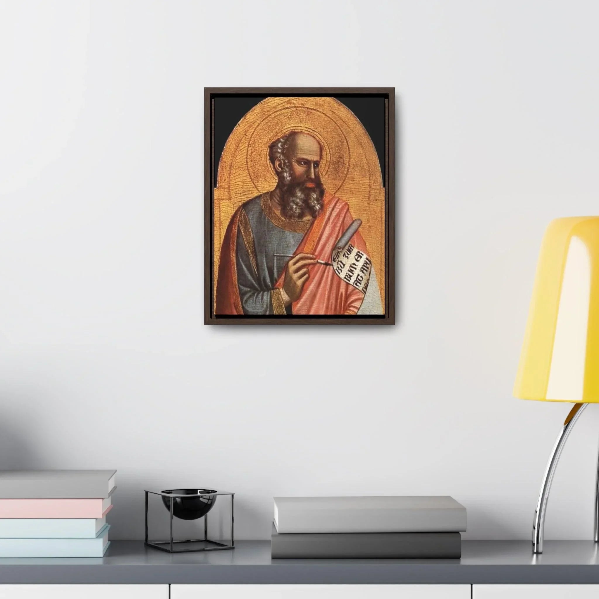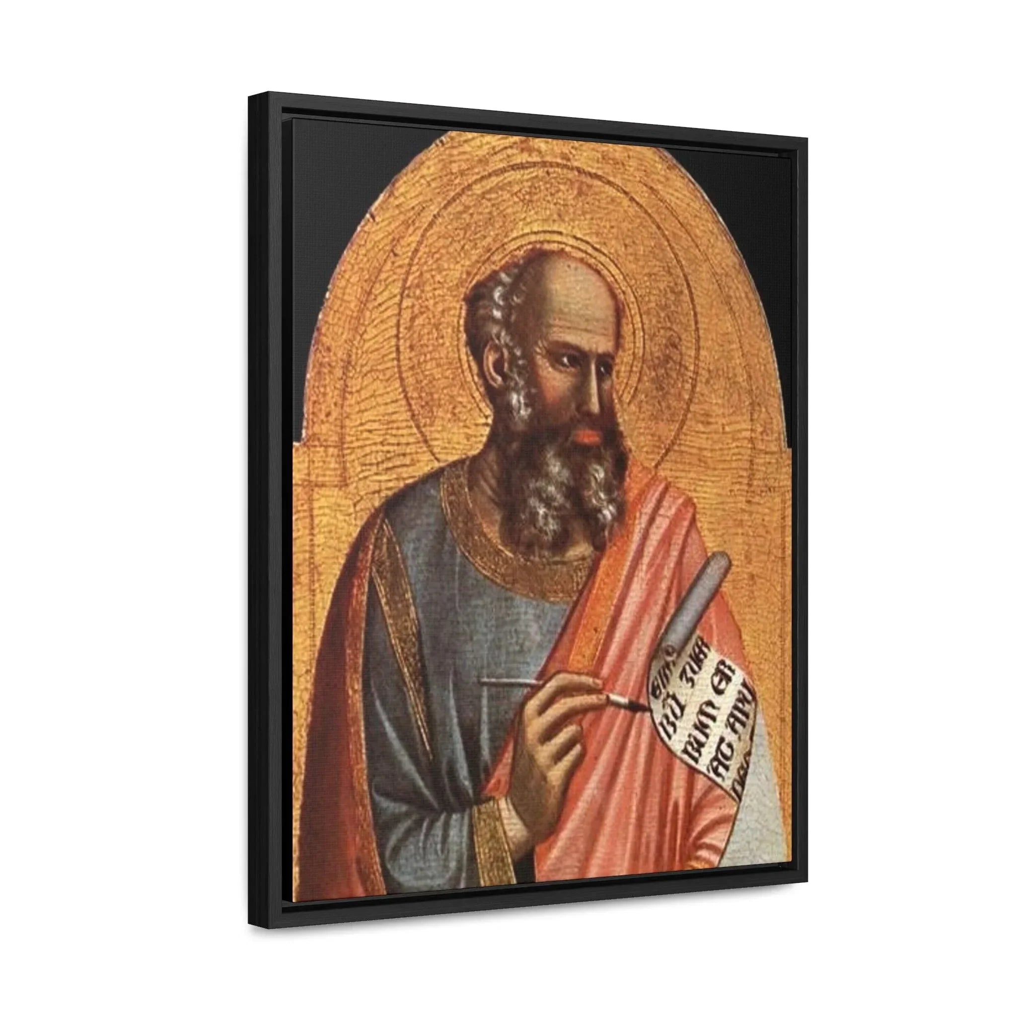 St-John-the-Evangelist - Giotto di Bondone- c.1320 - 1325 - Premium Framed Wrapped Canvas Print Dive into the depths of spirituality and artistic brilliance with the exquisite "Giotto St. John the Evangelist" artwork. Crafted with utmost reverence and meticulous attention to detail by the renowned Italian artist Giotto di Bondone, this high-quality framed canvas re-print invites you to embark on a journey of profound connection and contemplation. Transport yourself to the early 14th century, where the biblical figure of Saint John comes to life through Giotto's masterful brushstrokes. With profound reverence and spiritual depth, Saint John the Evangelist is portrayed in a way that captures the very essence of his role as an apostle and Gospel writer. The figure exudes a sense of wisdom and serenity, captivating the viewer and inviting them into the sacred world of this revered saint. Giotto's exceptional skill in conveying human emotion brings Saint John to life, forging a profound connection that transcends time and tradition. "Giotto St. John the Evangelist" is a testament to the artist's significant impact on the evolution of Western art during the Late Middle Ages. Through this remarkable portrayal, Giotto showcases his mastery of color and light, skillfully creating depth and emotion that draw the viewer into the spiritual realm of the subject. As one of the most celebrated painters of his time, Giotto's work continues to inspire awe and admiration, leaving an indelible impression on all who have the privilege of encountering it. Specifications: * Material: Crafted with 100% cotton fabric canvas, ensuring a high-quality reproduction that stays true to the original artwork * Frame: Encased in a poplar wood frame with a choice of walnut or black finish, offering a touch of elegance and versatility to suit your personal style * Image quality and detail: Experience the utmost clarity and precision, with high-quality image reproduction that captures every nuanced brushstroke and detail, allowing you to appreciate the artistry in its full glory Please note: This stunning piece is intended for indoor use only, where it can serve as a cherished centerpiece, a source of inspiration, or a symbol of devotion. Allow the timeless beauty and artistic brilliance of "Giotto St. John the Evangelist" to grace your sacred space. Immerse yourself in the transformative power of art and spirituality, and adorn your home with a piece that continues to inspire contemplation and devotion across the centuries.