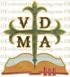 The VDMA Bible is a part of the 500th Anniversary Collection created by Edward Riojas and Carrie Roberts to mark the Celebration of Lutheran Heritage. This design is rich with meaning and symbolism from the VDMA which means the Word of the Lord Endures Forever to the open Bible with the three ribbons (three in number referring to Trinity). The VDMA Bible Design is available in 3 sizes.