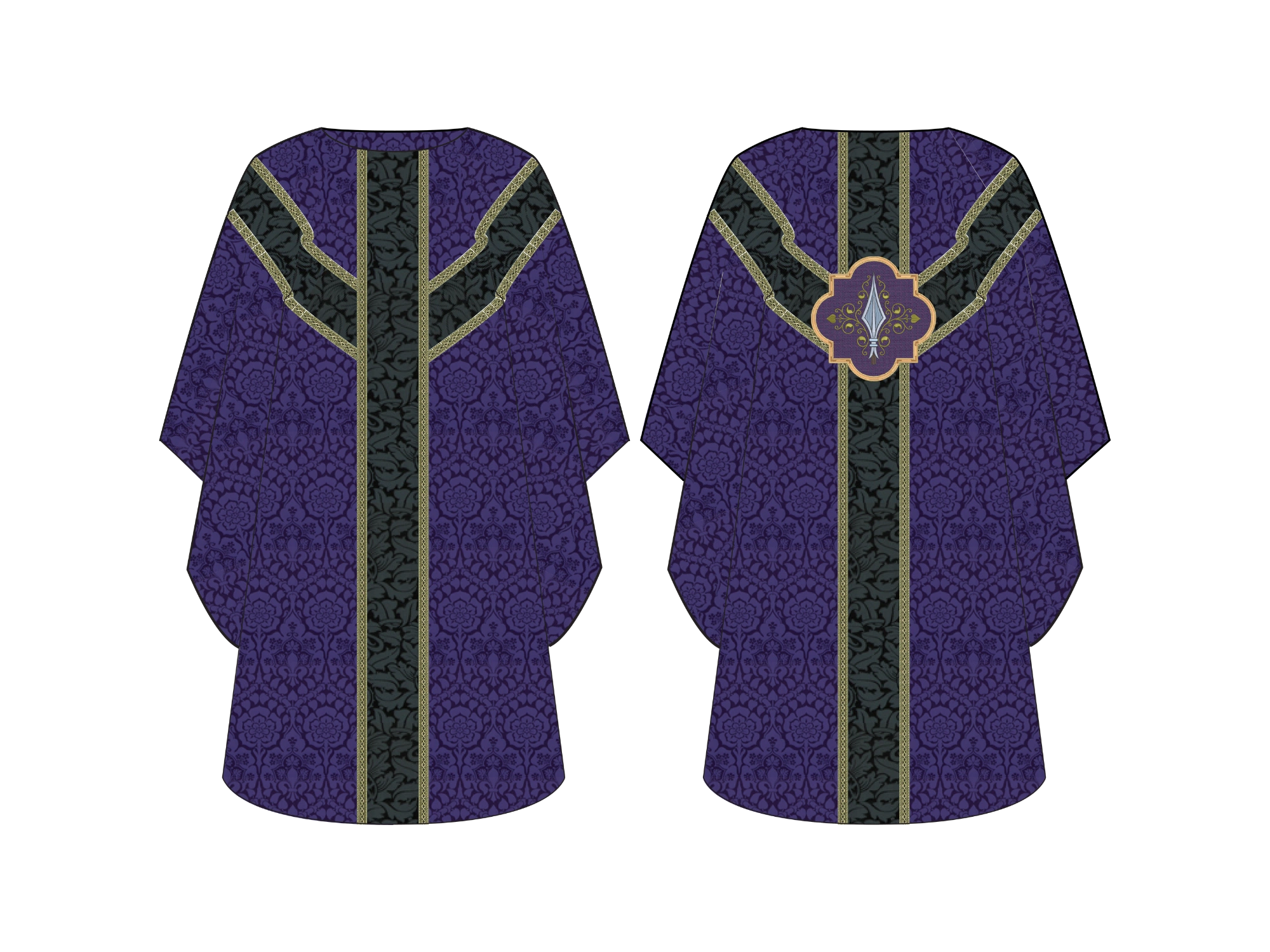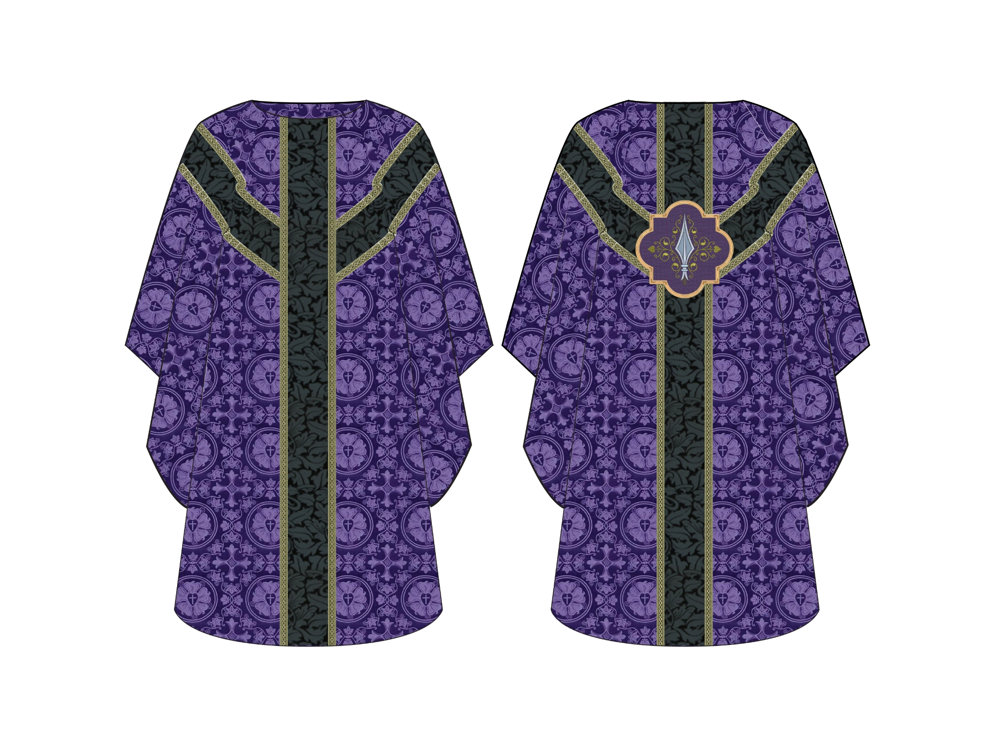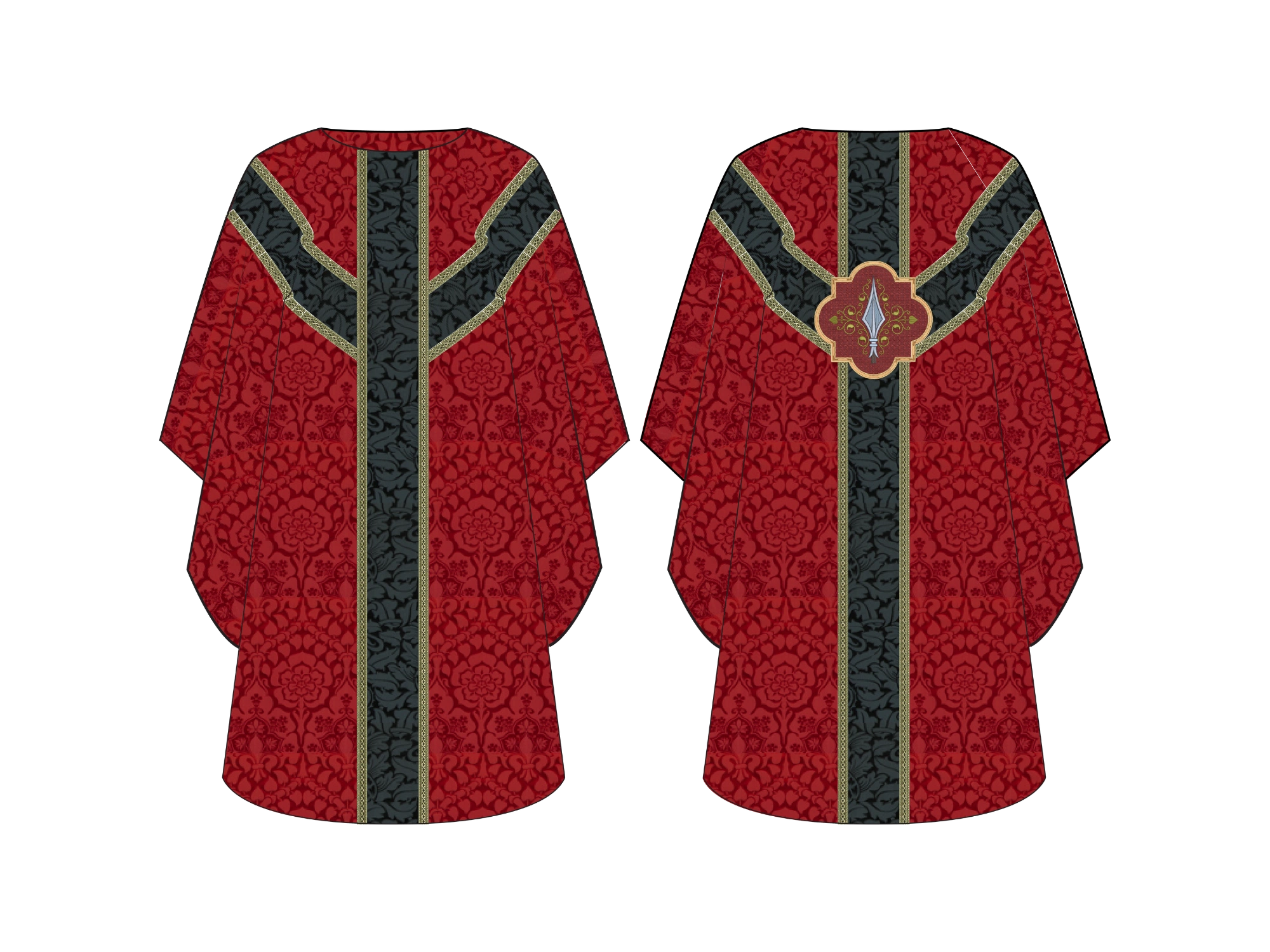 - Spear appliqué positioned on the back symbolizing Christ’s Passion