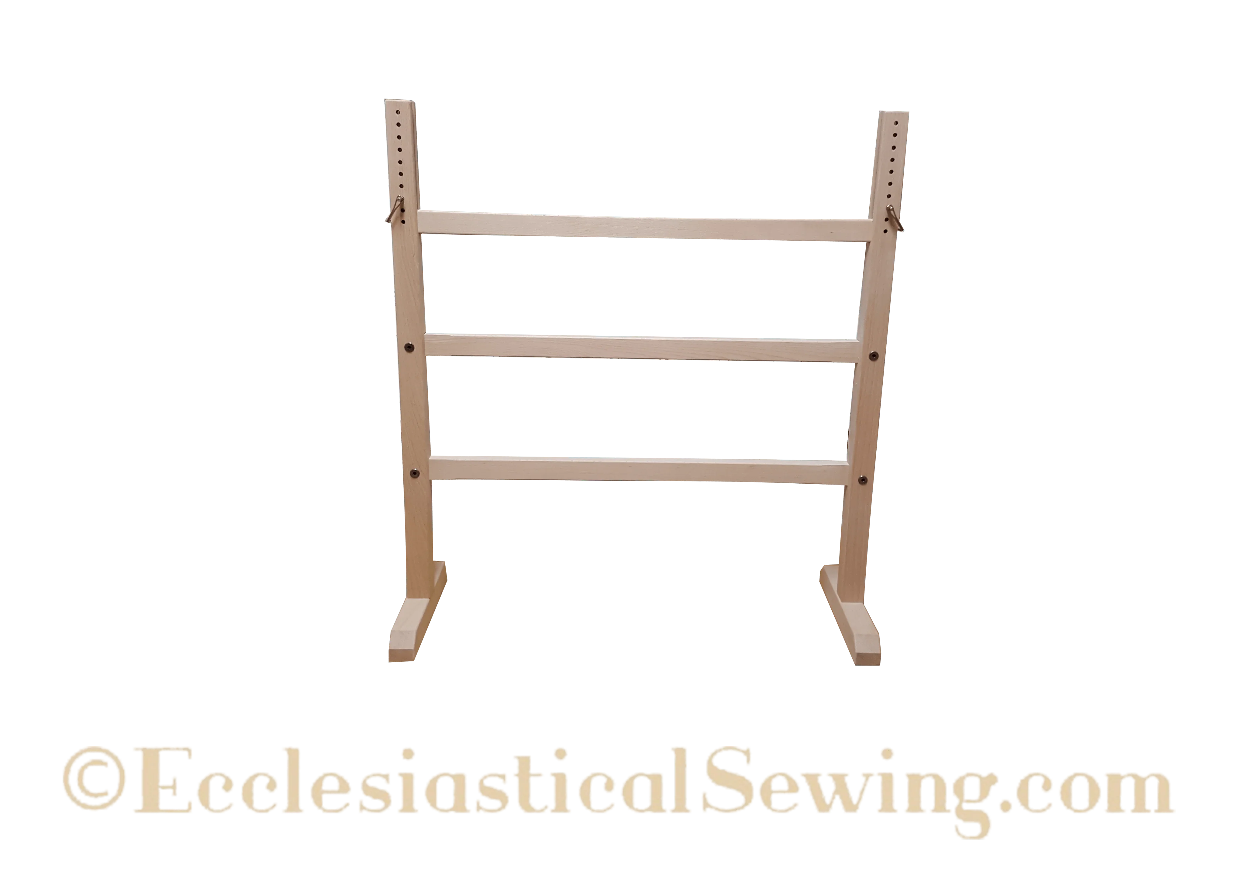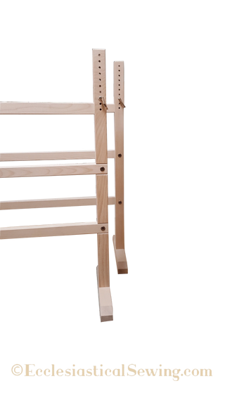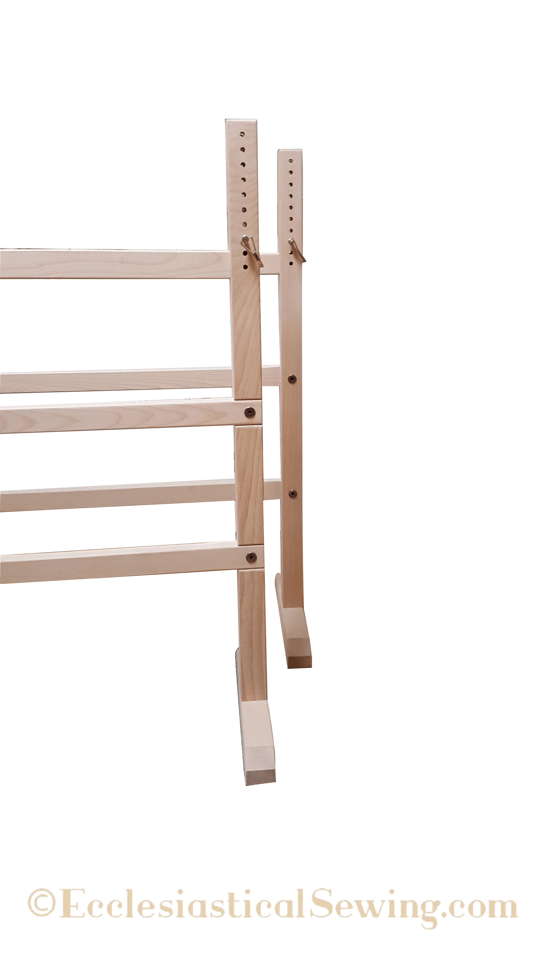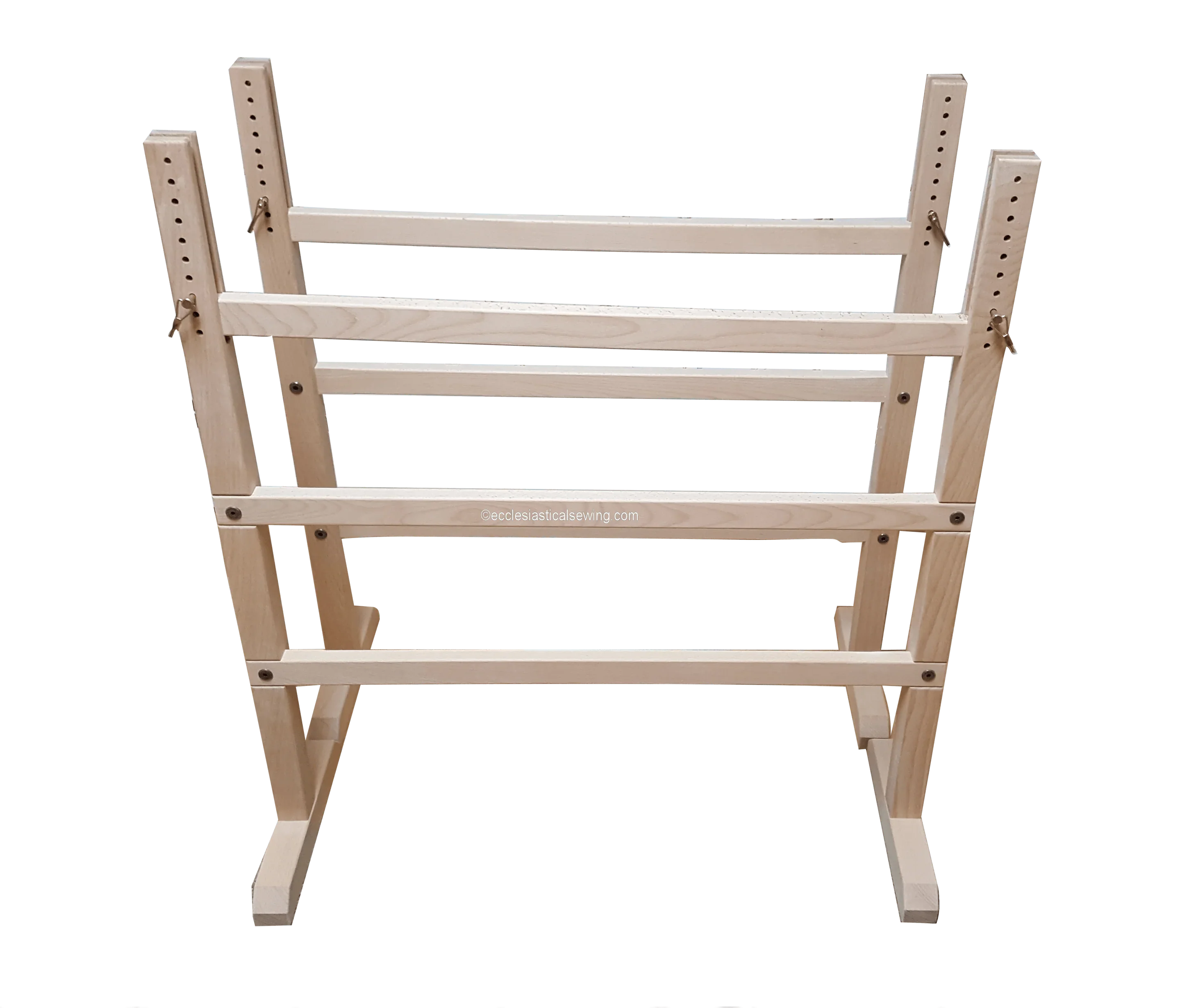The Trestle Stands are designed to hold slate frames for hand embroidery. The Bars are 36 inches long. The trestle height is adjustable with the use of clamps and holes in the stand arms. The Trestle frame has been designed to be easily assembled and taken apart for transporting to and from classes and events.